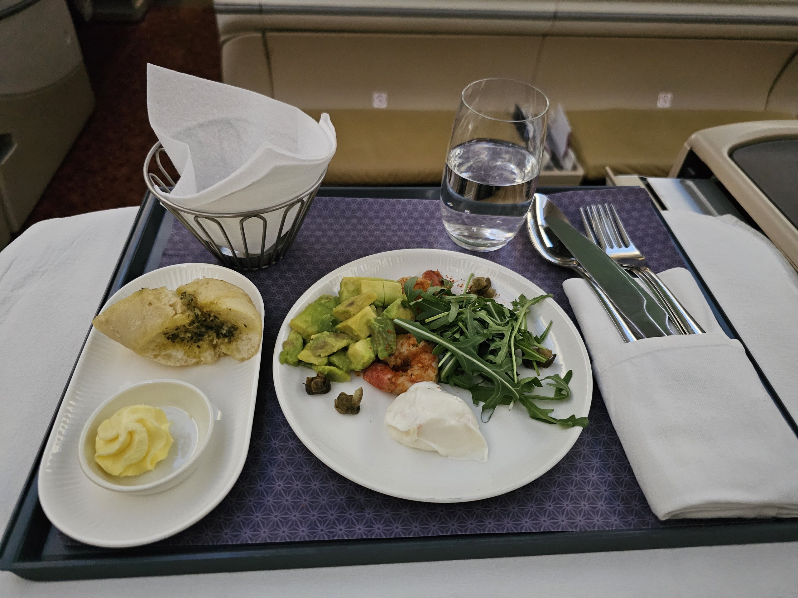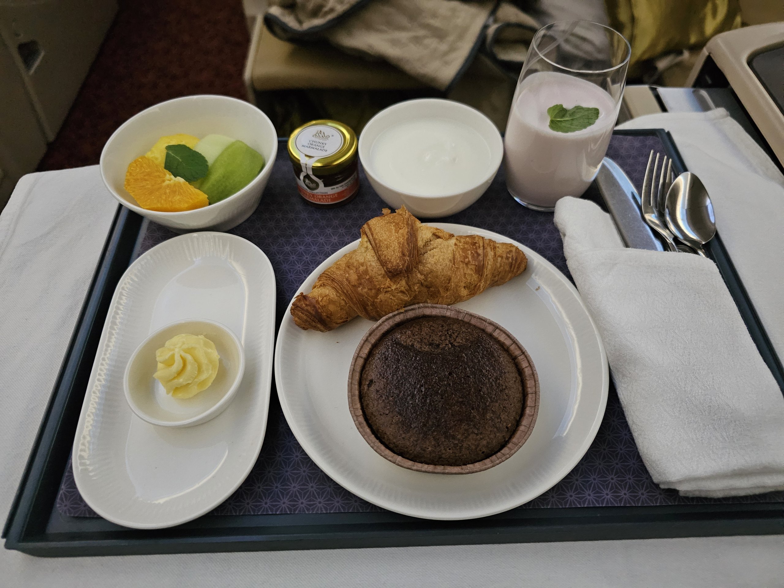 Også her er det totalt tre serveringer - et hovedmåltid umiddelbart etter take-off, en liten varm snack midt på flyet til å sove på og frokost før landing.