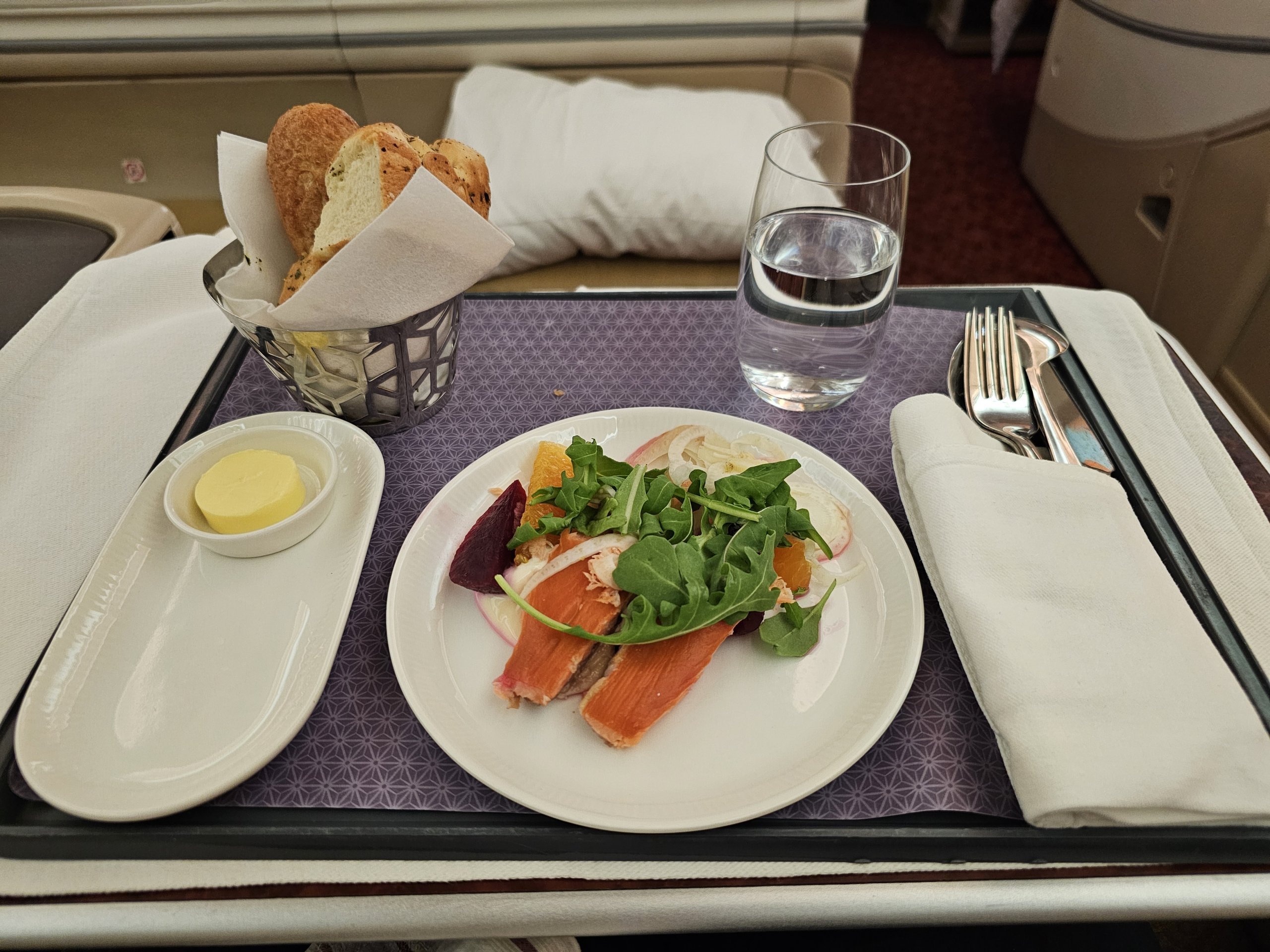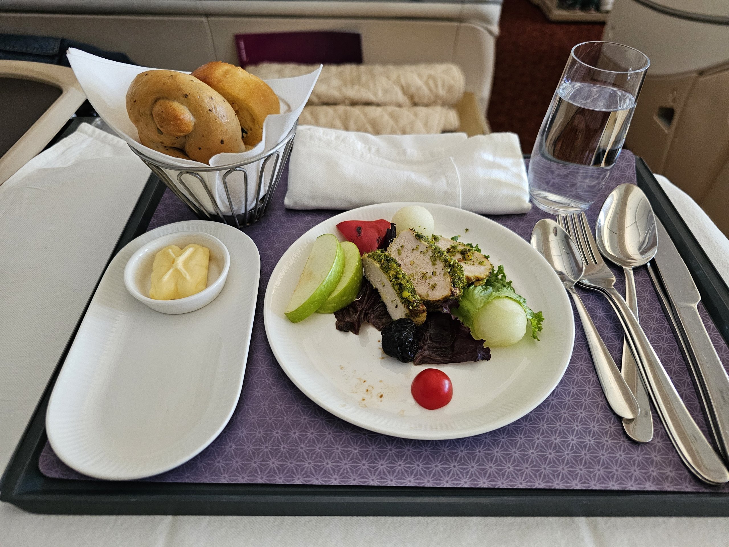 Vi starter med en hovedservering og får servert salat og dessert før landing. Vi velger en fruktbolle kun ved den andre serveringen.