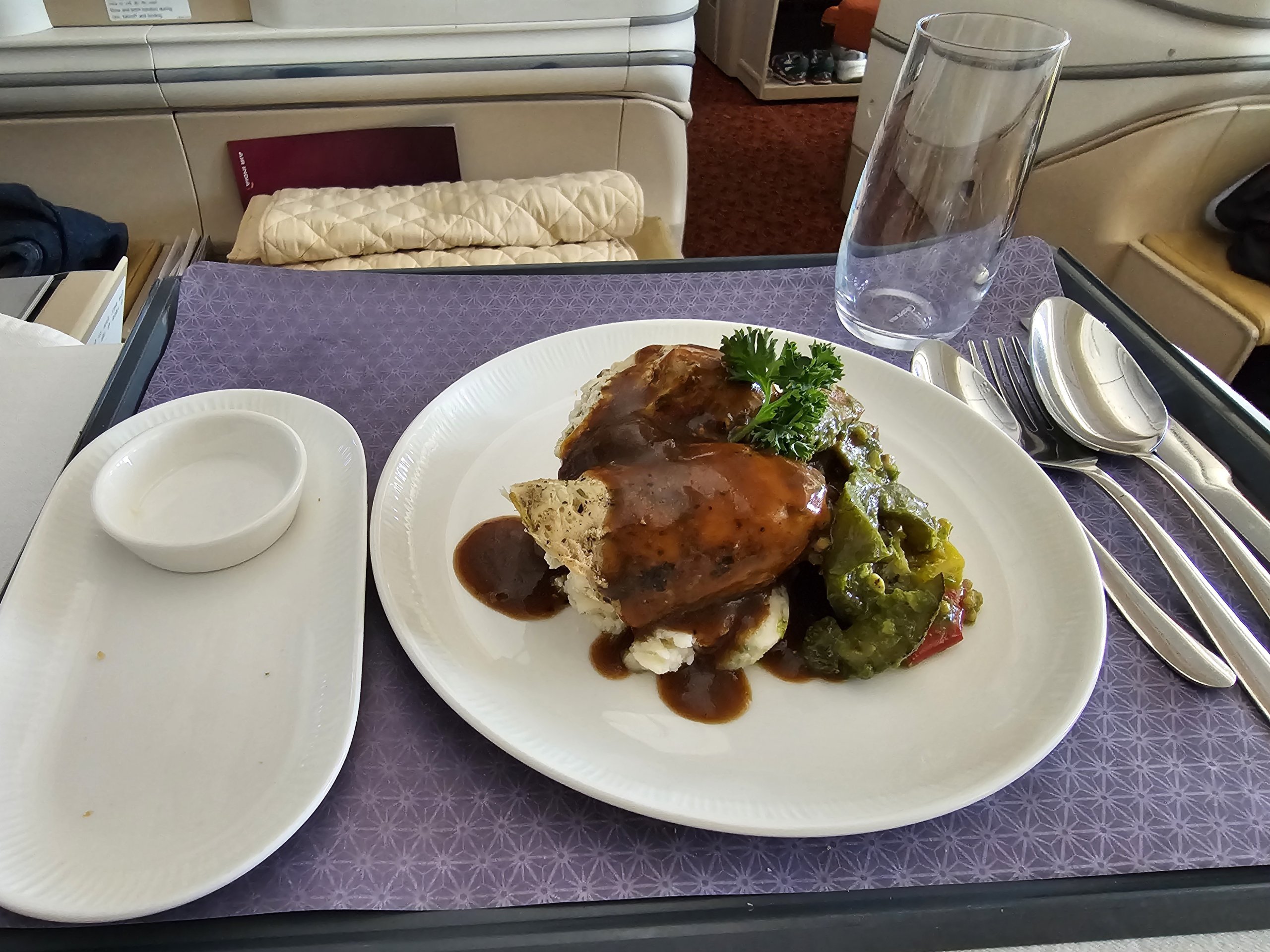 Når det gjelder servicen og maten under selve flyvningen, vil vi karakterisere den som gjennomsnittlig. Det var ikke mye mat, og det var heller ikke førsteklasses. På den annen side var den heller ikke direkte dårlig, og hvis man var sulten, kunne man alltid bestille litt ekstra snacks fra besetningen (kaffe, kjeks, nøtter osv.).