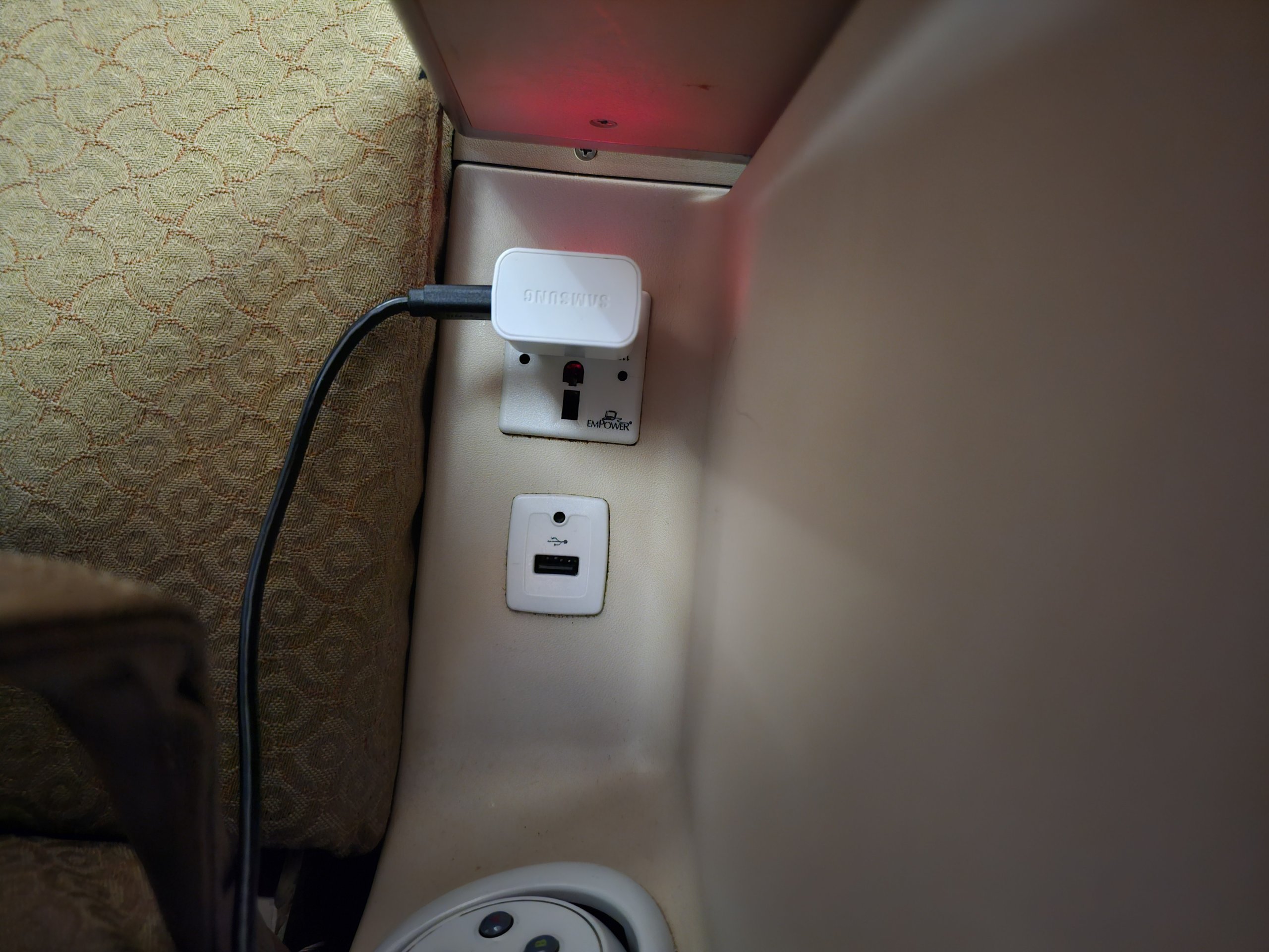 Hvert sete er også utstyrt med en internasjonal stikkontakt. Det er imidlertid ikke bra å stole på at det skal fungere. På fire flyvninger fungerte pluggen ved setet mitt bare to ganger.