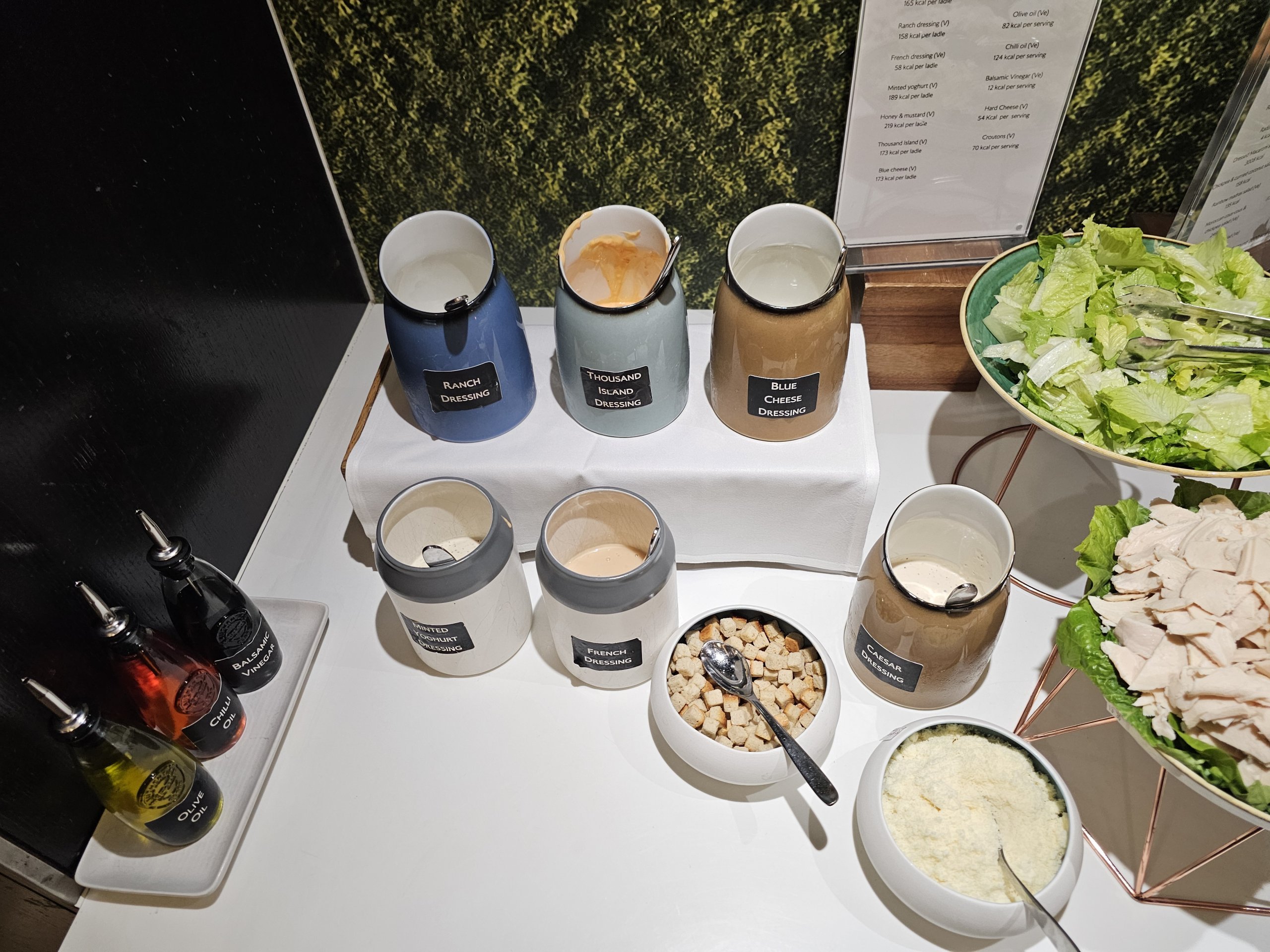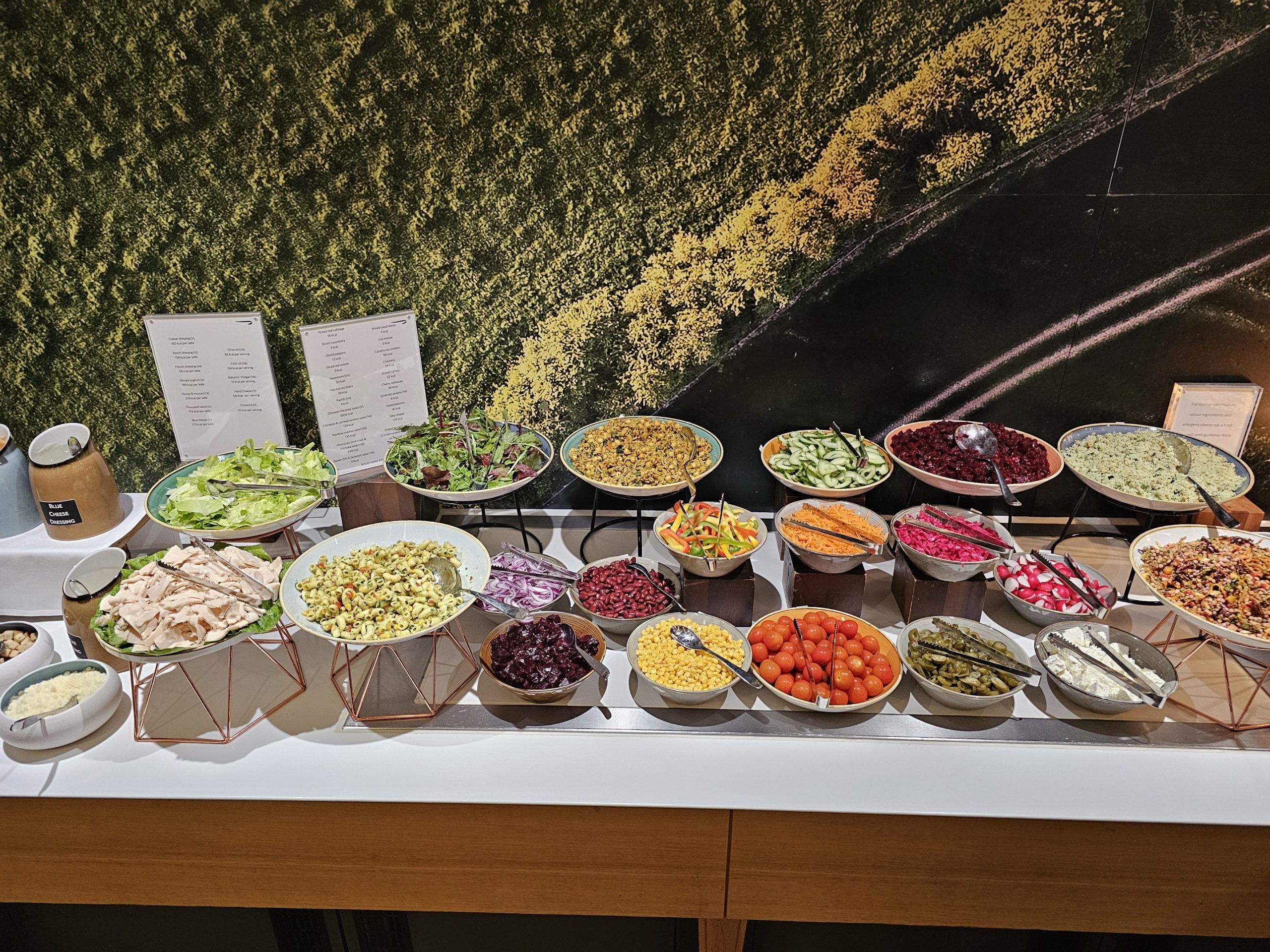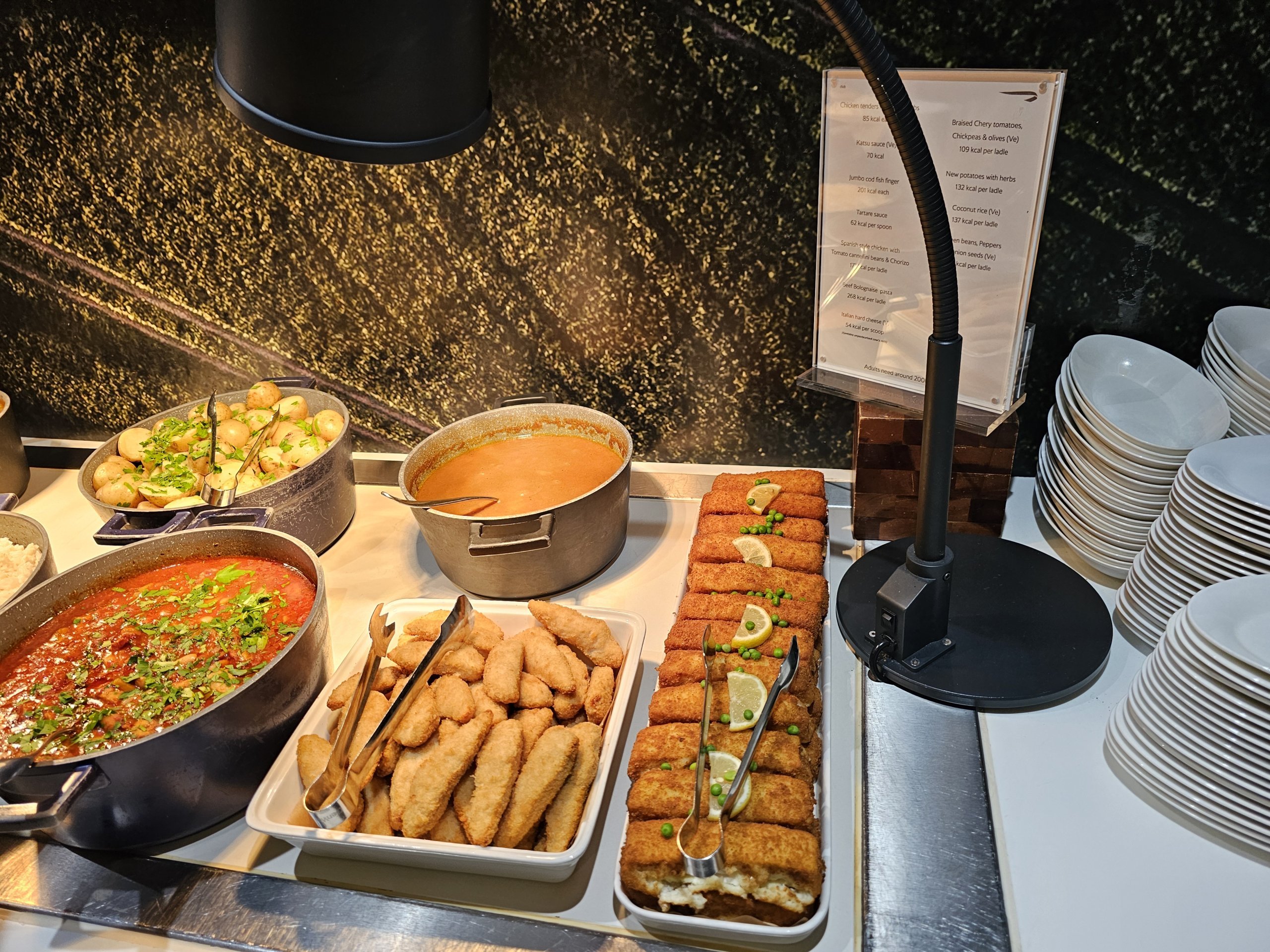 Kaldmatmenyen inneholder noen få grønnsaker, en salat med et utvalg av forskjellige dressinger og et veldig begrenset og svakt utvalg av bakverk (praktisk talt bare søtt).