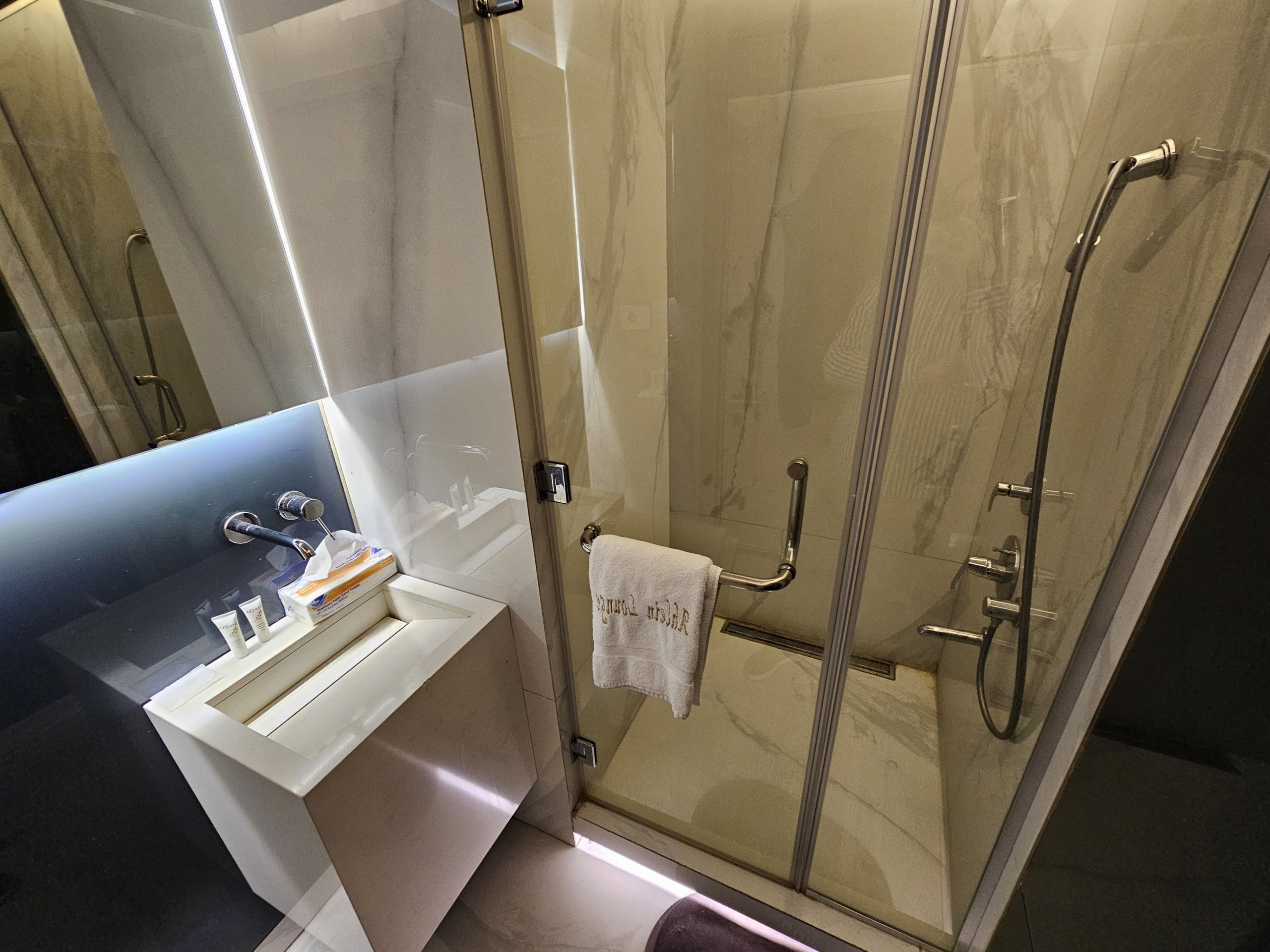 Den elegante atmosfæren forsterkes av den blå nattbelysningen, da flyet vårt har avgang kl. 04.35.