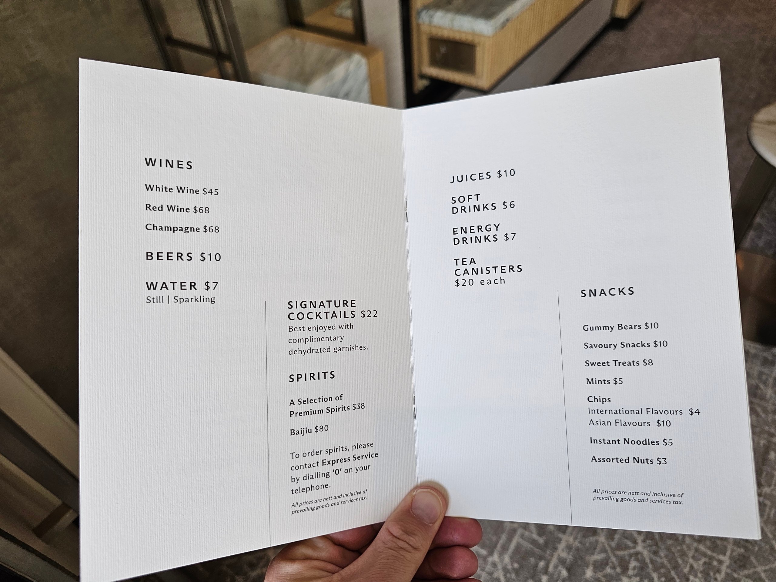 - cocktailbar (cocktailer mot betaling, standard hotellpriser rundt 22 sgd)