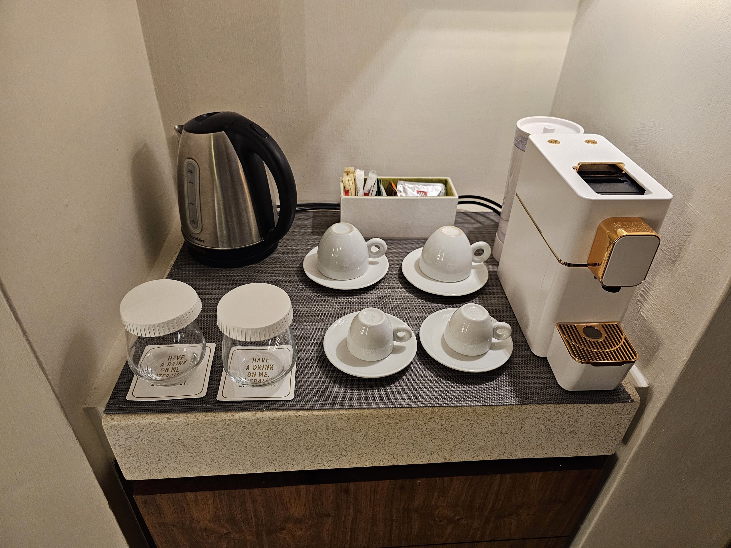 Det er en kapsel kaffemaskin, vannkoker og et utvalg av te på kjøleskapet.