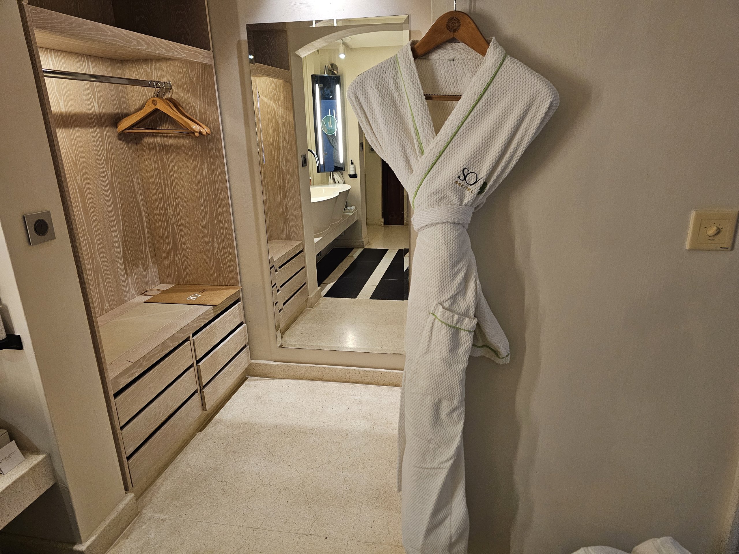 I garderoben er det tøfler, badekåpe, hårføner, store håndklær som passer for et opphold ved bassenget, samt en pose for skitne klær som skal vaskes av hotellets service.