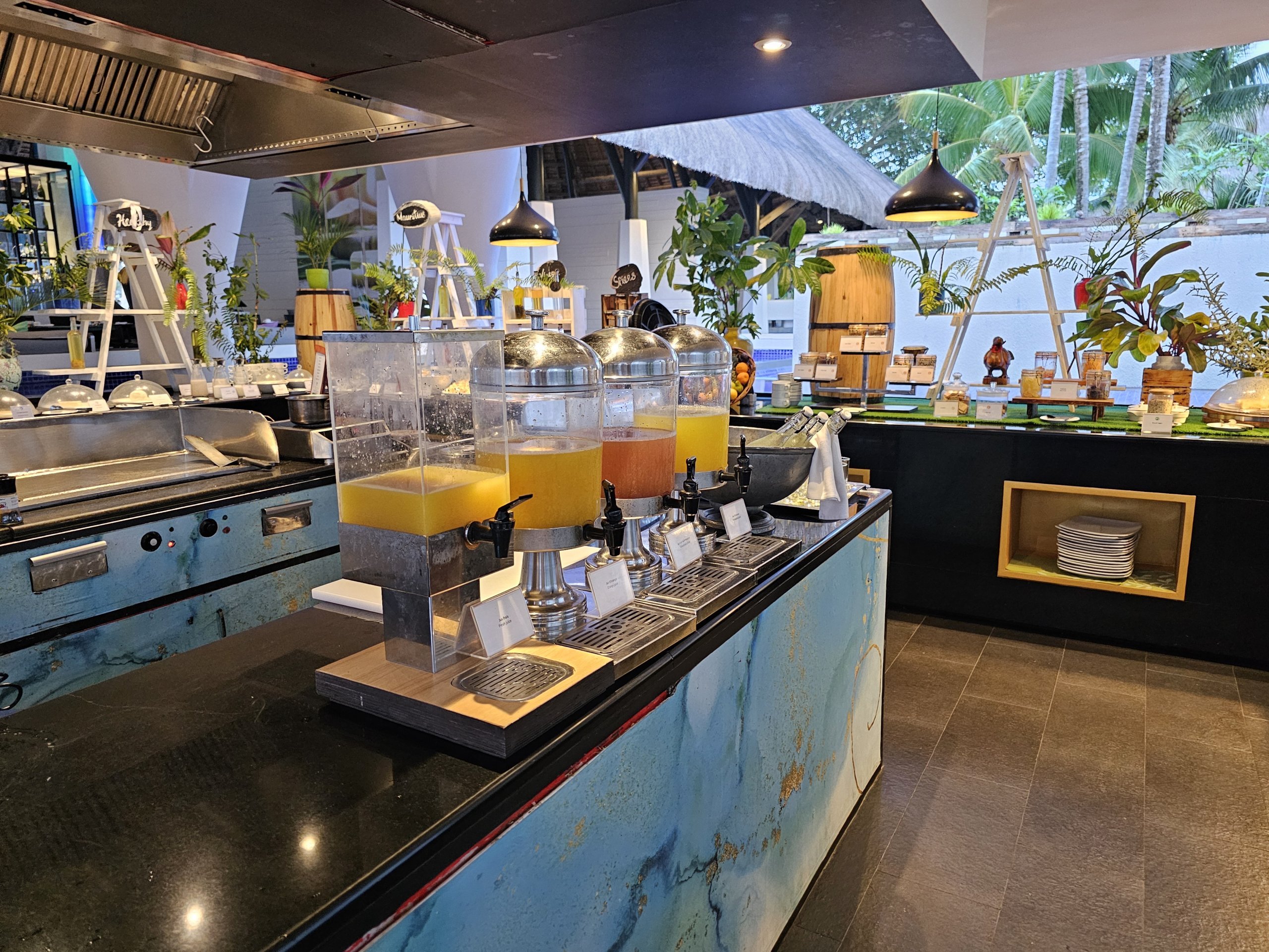 Frokosten serveres i feriestedets største bygning, som huser restauranten Flamboyant og baren Takamaka.