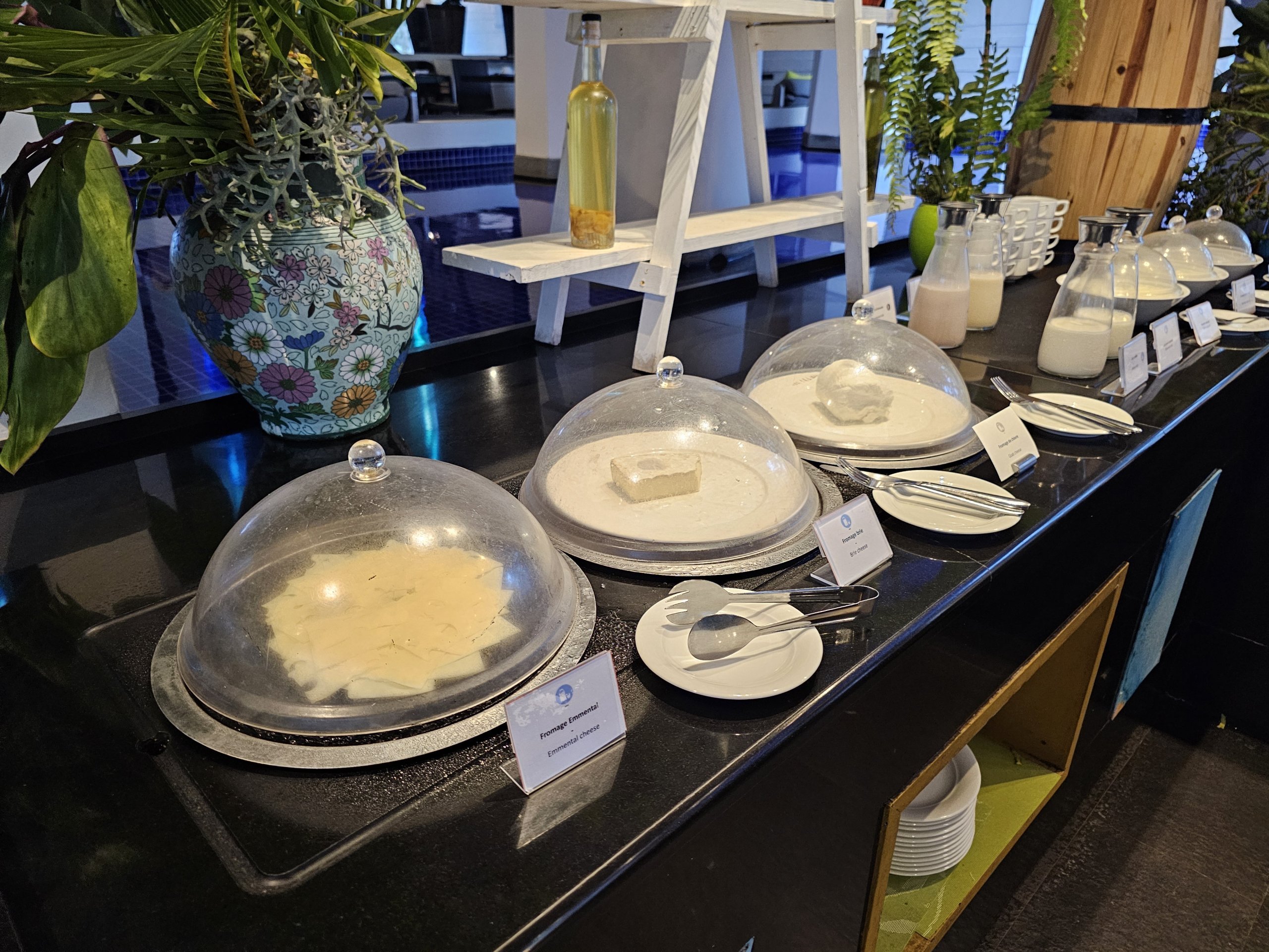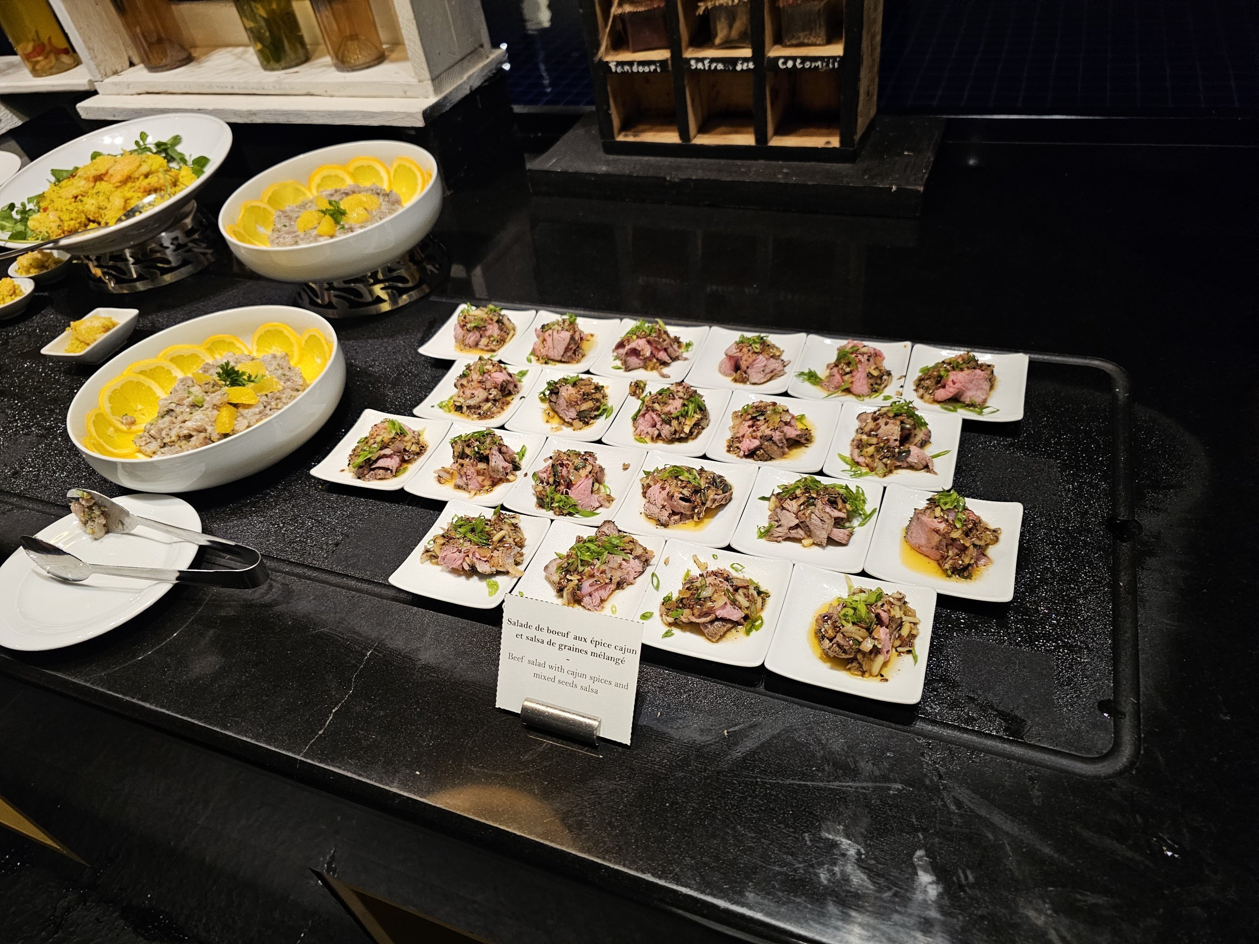 Den kalde og søte buffeen inneholder et ganske godt utvalg av vestlige retter (oster, skinke), et stort utvalg av frukt, grønnsakssalater og pålegg, og et godt utvalg av søtsaker og bakverk.