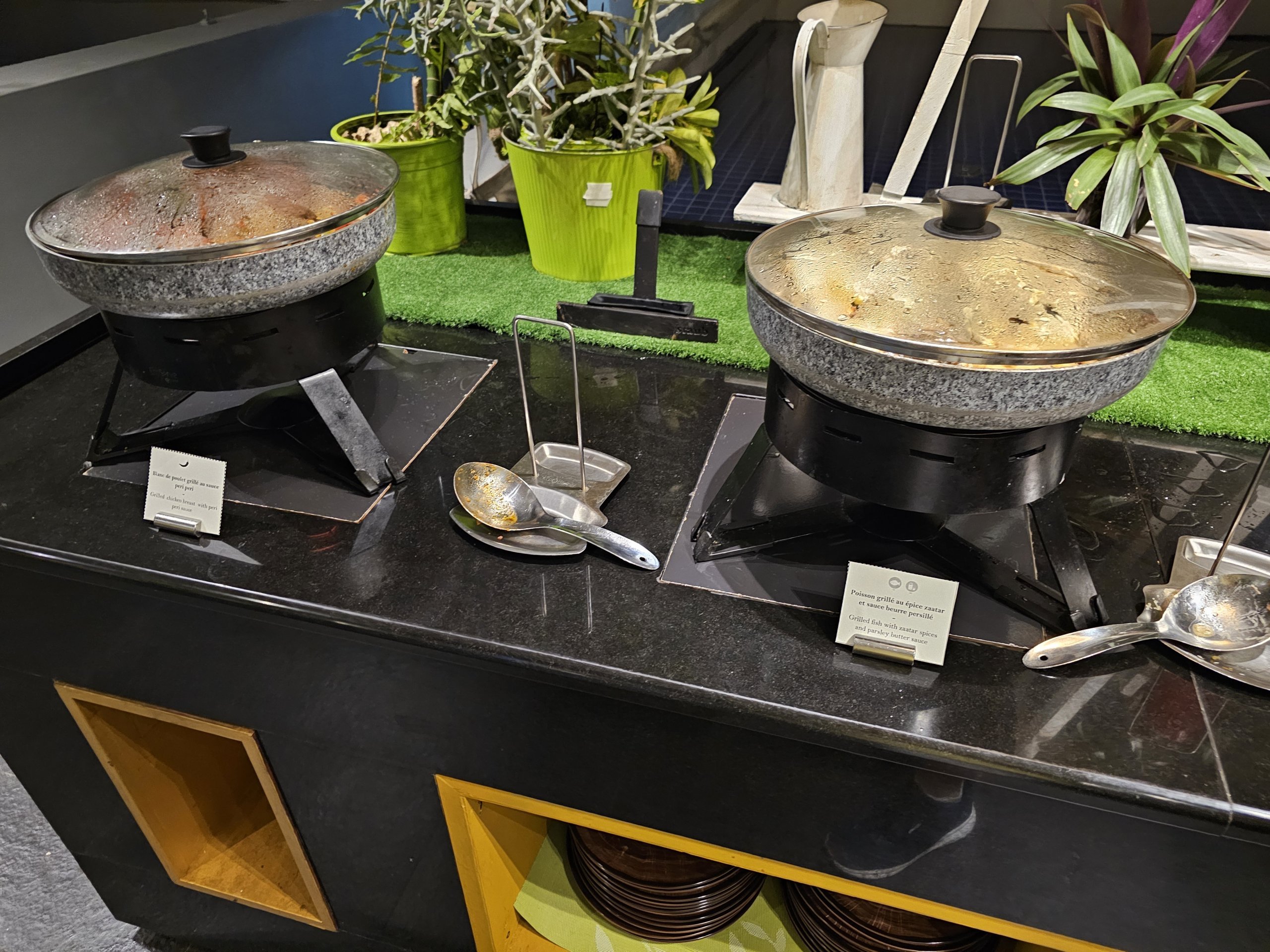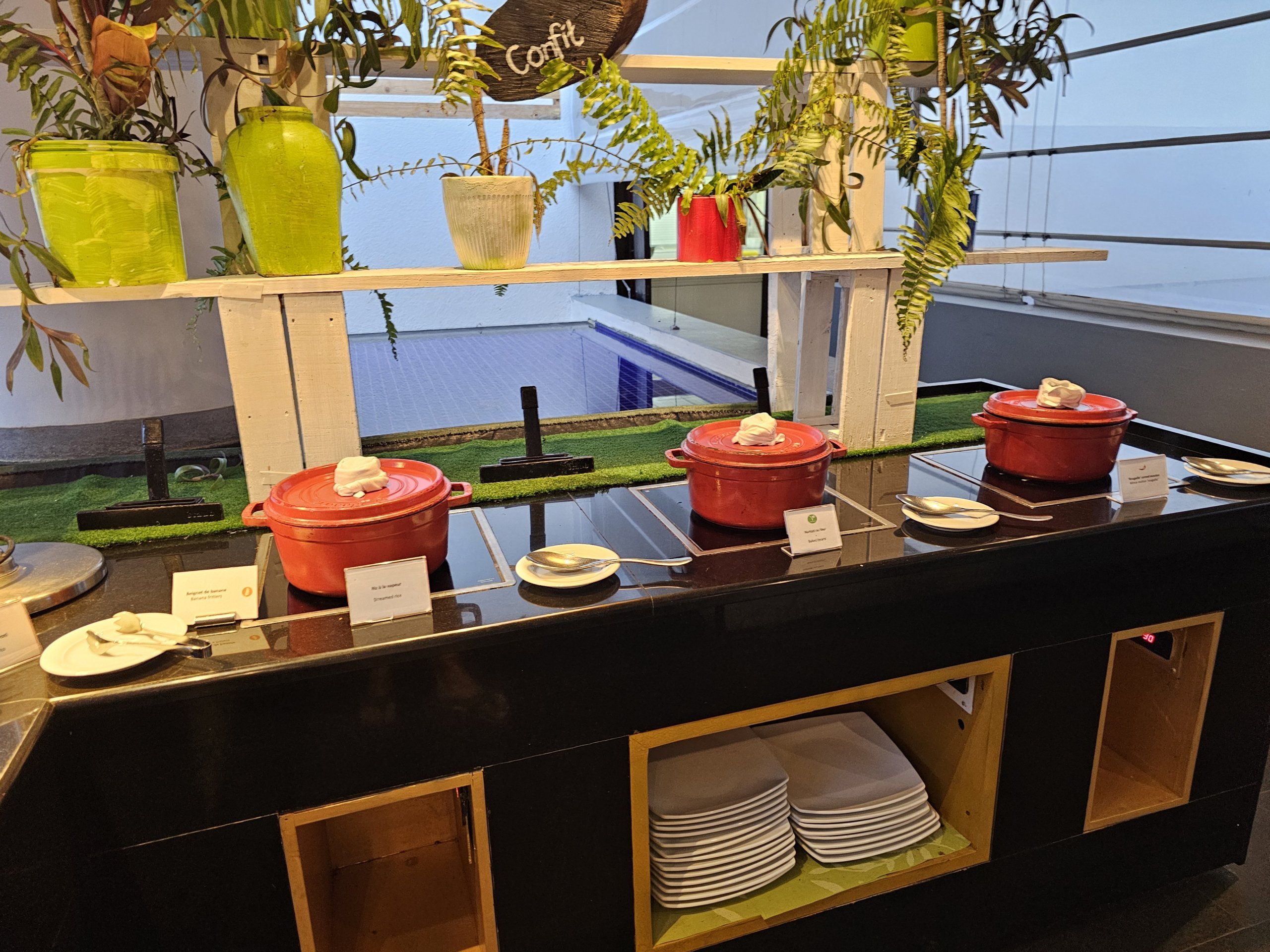 Utvalget inkluderer standard pølser, bacon, bønner, egg på mange måter og tre standard varme retter som den typiske rougaille.