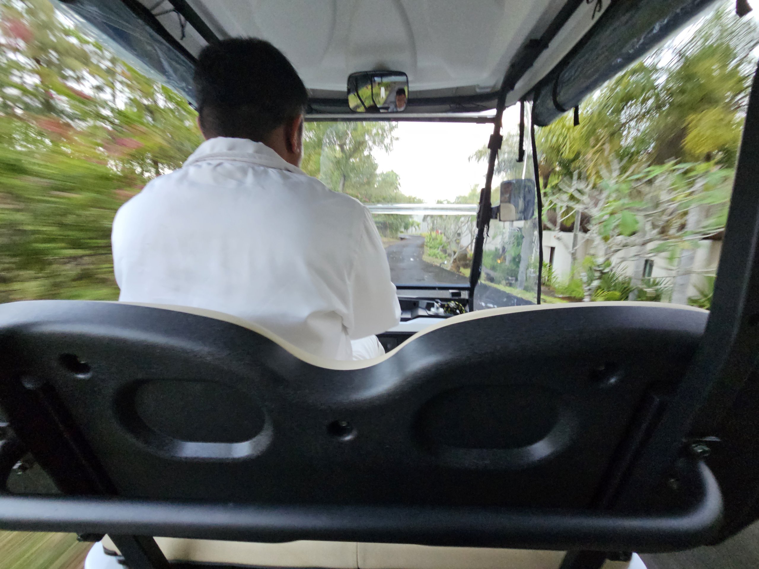 Inngangen ligger omtrent 500 meter fra resepsjonen, dit jeg blir kjørt med bagasjen min i en elektrisk golfbil. Jeg venter ikke et minutt, vognene er parkert i velkomstpaviljongen.