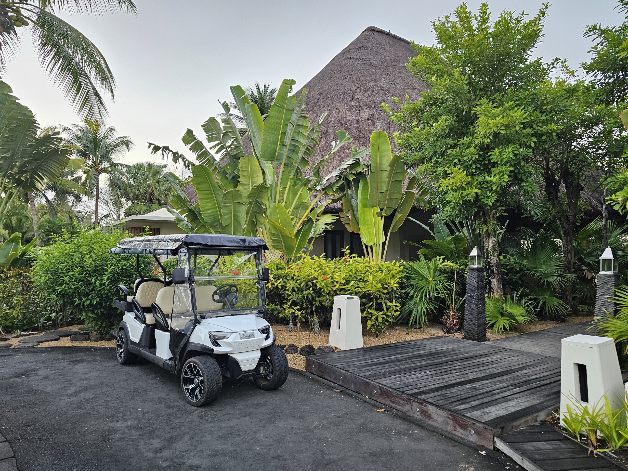 Det er asfalterte gangstier over hele feriestedet, men siden området er så stort, får gjestene utdelt golfbiler med sjåfør.