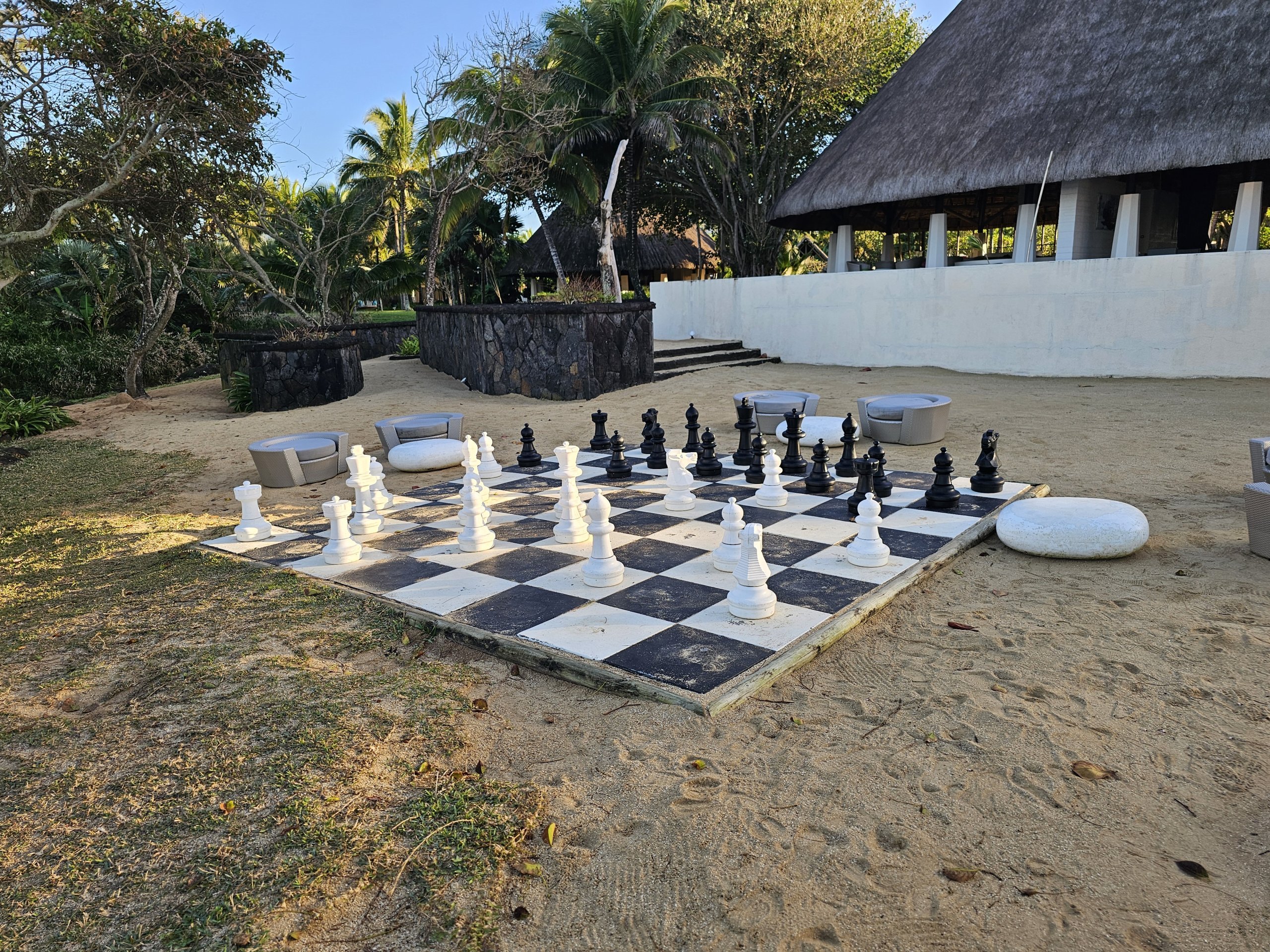 Mellom Takamaka-baren og bassenget kan du spille sjakk på den store spillebanen, der både barn og voksne vil ha det gøy.
