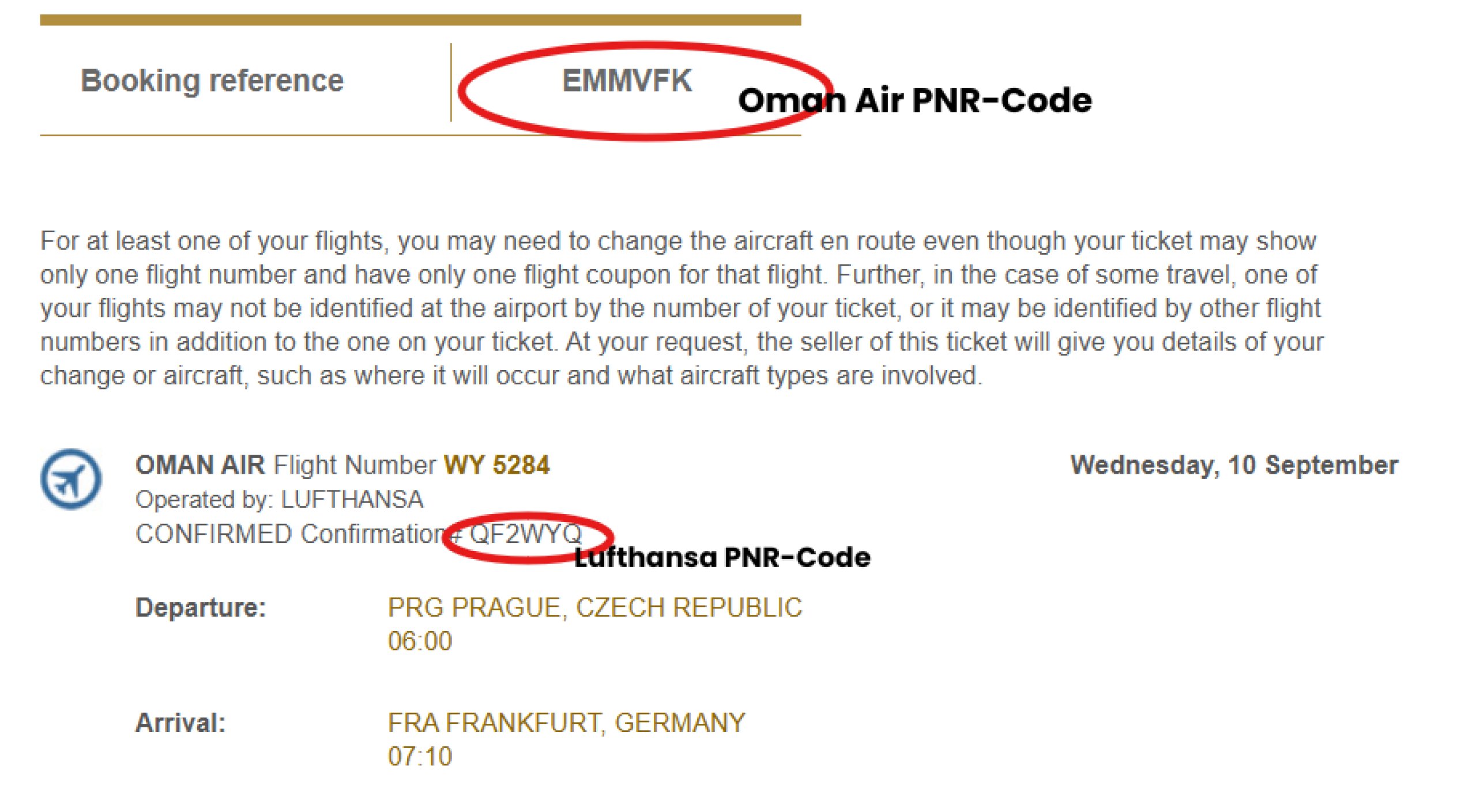Alle flyreisene ble kjøpt som én bestilling, men Lufthansa-flyreisen fra Praha til Frankfurt hadde en annen PNR-kode enn Oman Air-flyreisen fra Frankfurt FRA via Muscat MCT til Zanzibar ZNZ.
