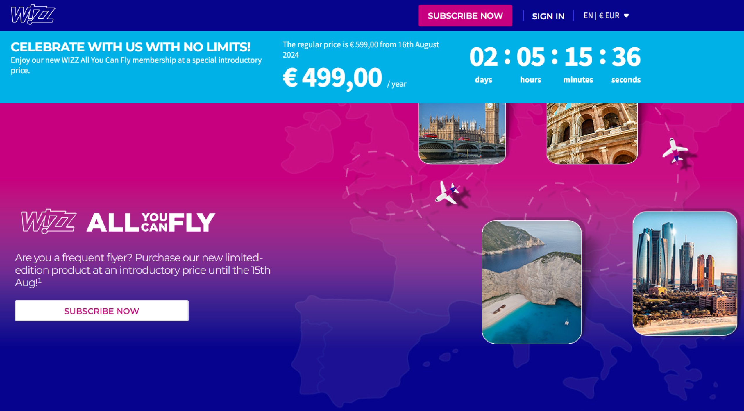 All You Can Fly-abonnementet er gyldig i 12 måneder fra kjøpsdatoen. Du kan imidlertid kjøpe medlemskapet ditt nå på wizzair.com.