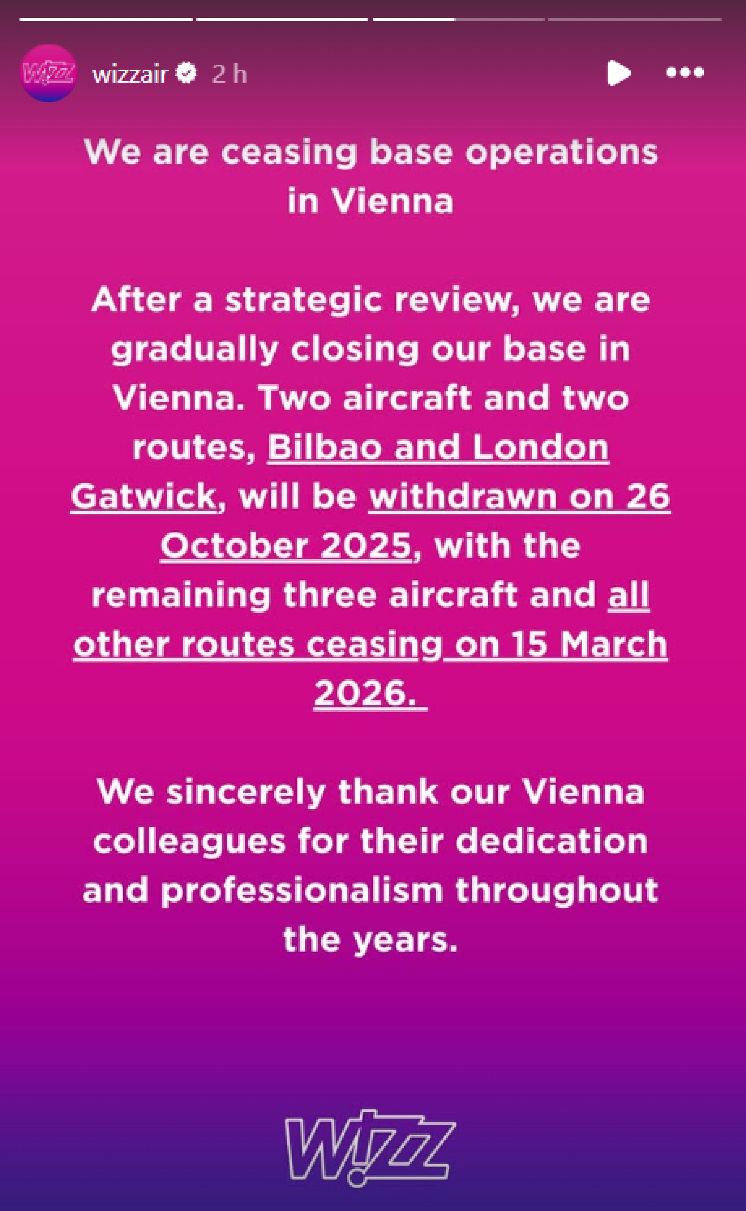 Wizz Air kunngjorde i dag på sin Instagram-profil at de vil stenge basen i Wien, hvor de for tiden har 5 fly basert.
