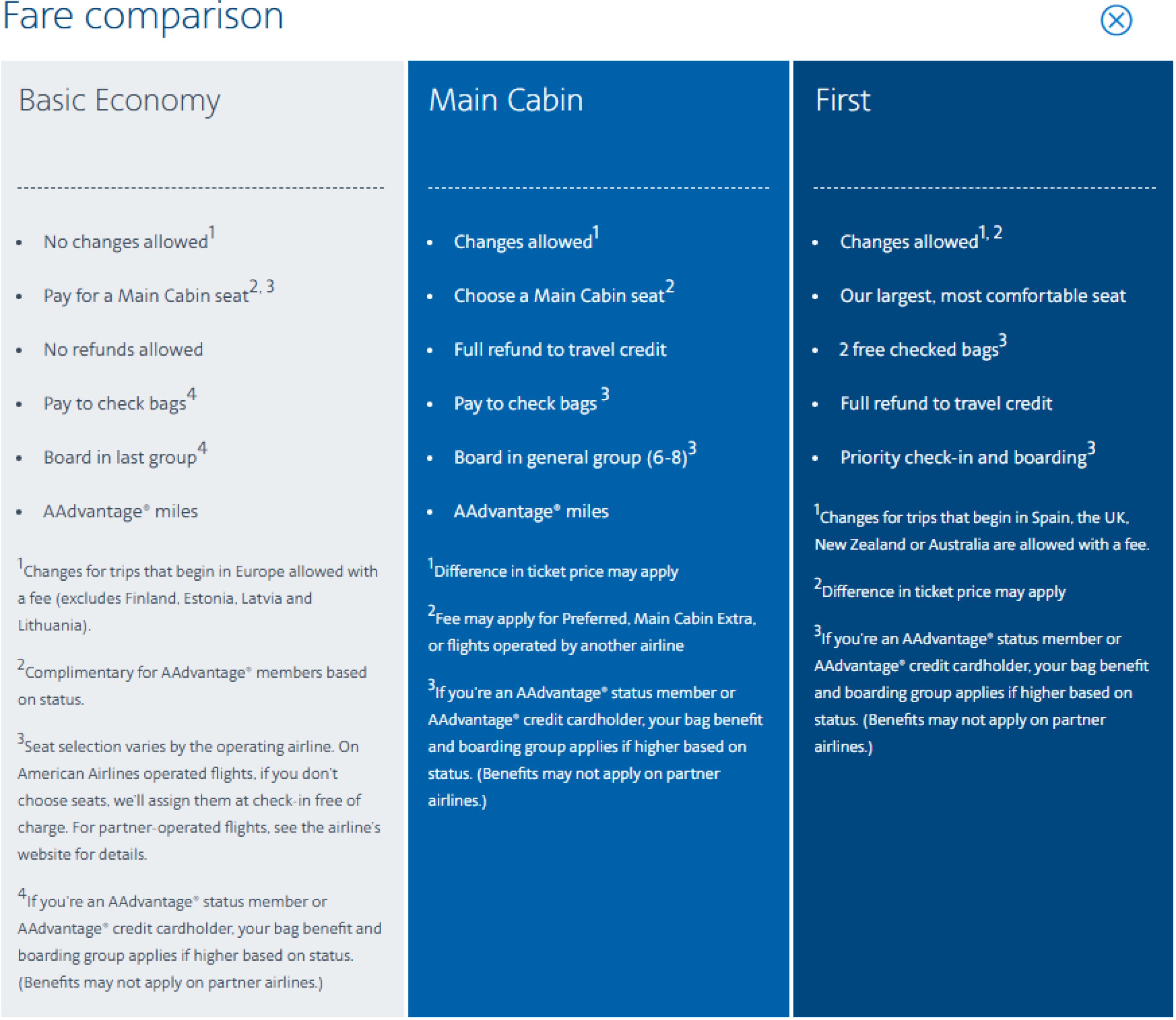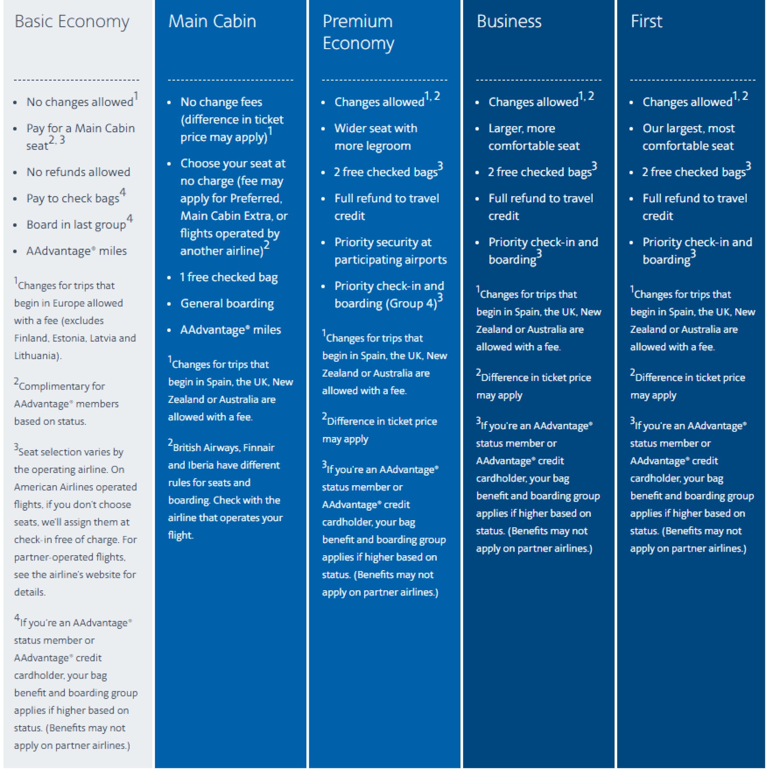 American Airlines tilbyr økonomi-, premium økonomi-, business- og førsteklasse på flyene sine.