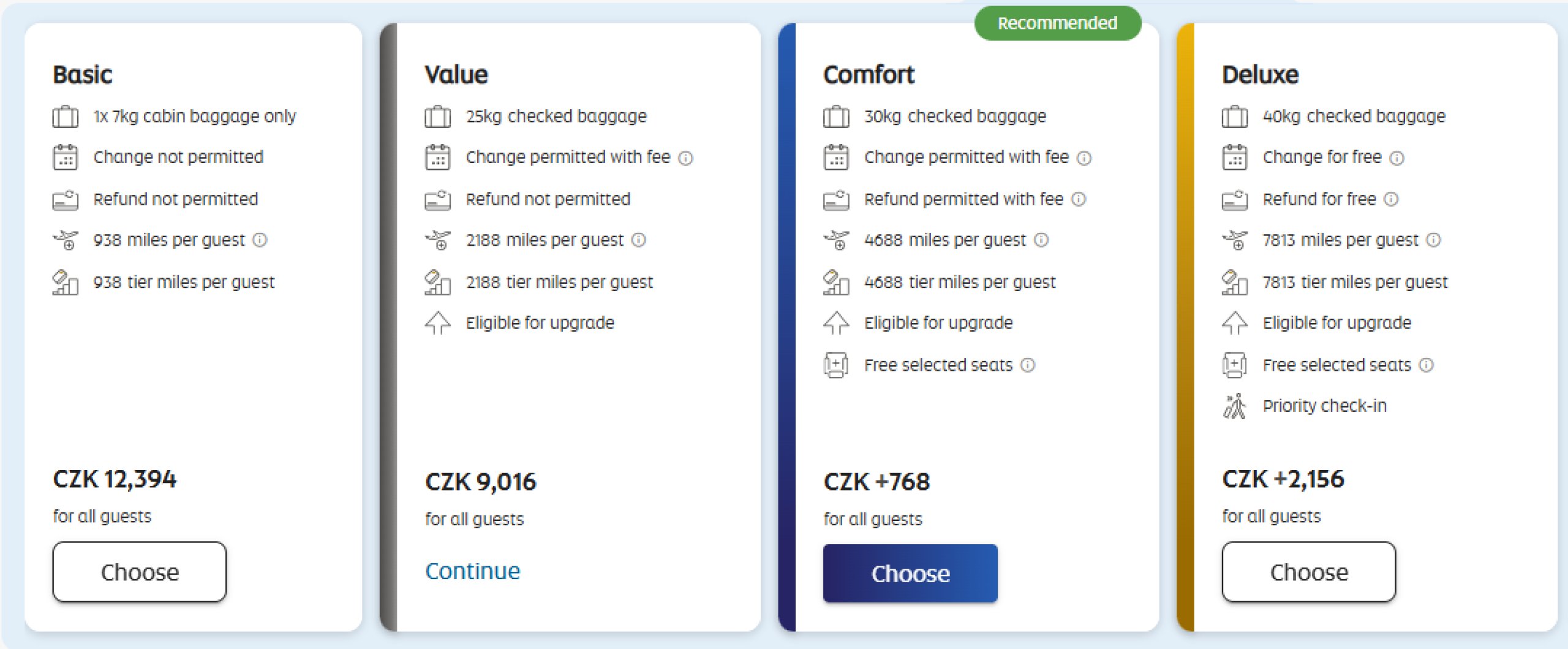 De ulike klassene er videre delt inn i ulike prisgrupper, som skiller seg fra hverandre for eksempel når det gjelder antall bagasjerom, muligheten for å endre billetten eller antall bonuspoeng som krediteres per flyvning.