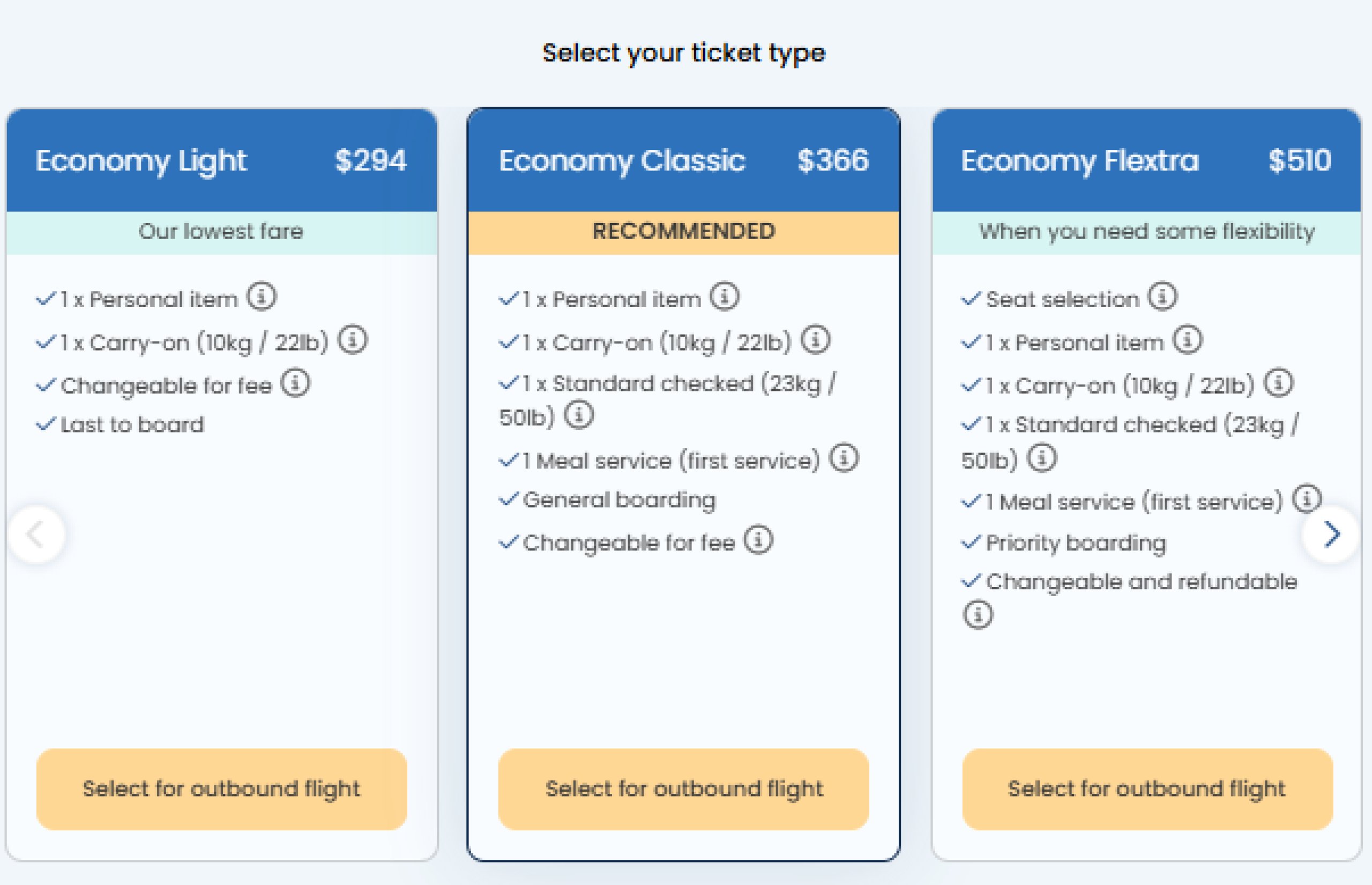 De ulike klassene er videre delt inn i prisgrupper, som skiller seg fra hverandre for eksempel når det gjelder antall tillatte bagasjerom, muligheten for å endre billetter eller valg av et bestemt sete gratis.
