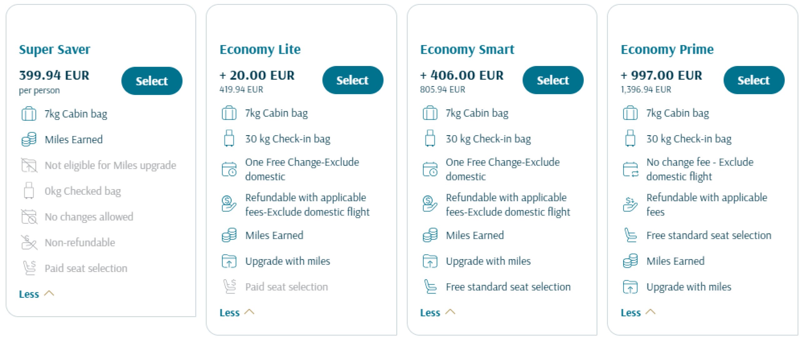 Disse to klassene er videre inndelt i ulike billettpriser, som hovedsakelig skiller seg fra hverandre når det gjelder avbestillings- og endringsbetingelser eller antall bonuspoeng du tjener opp for en gitt flyvning.