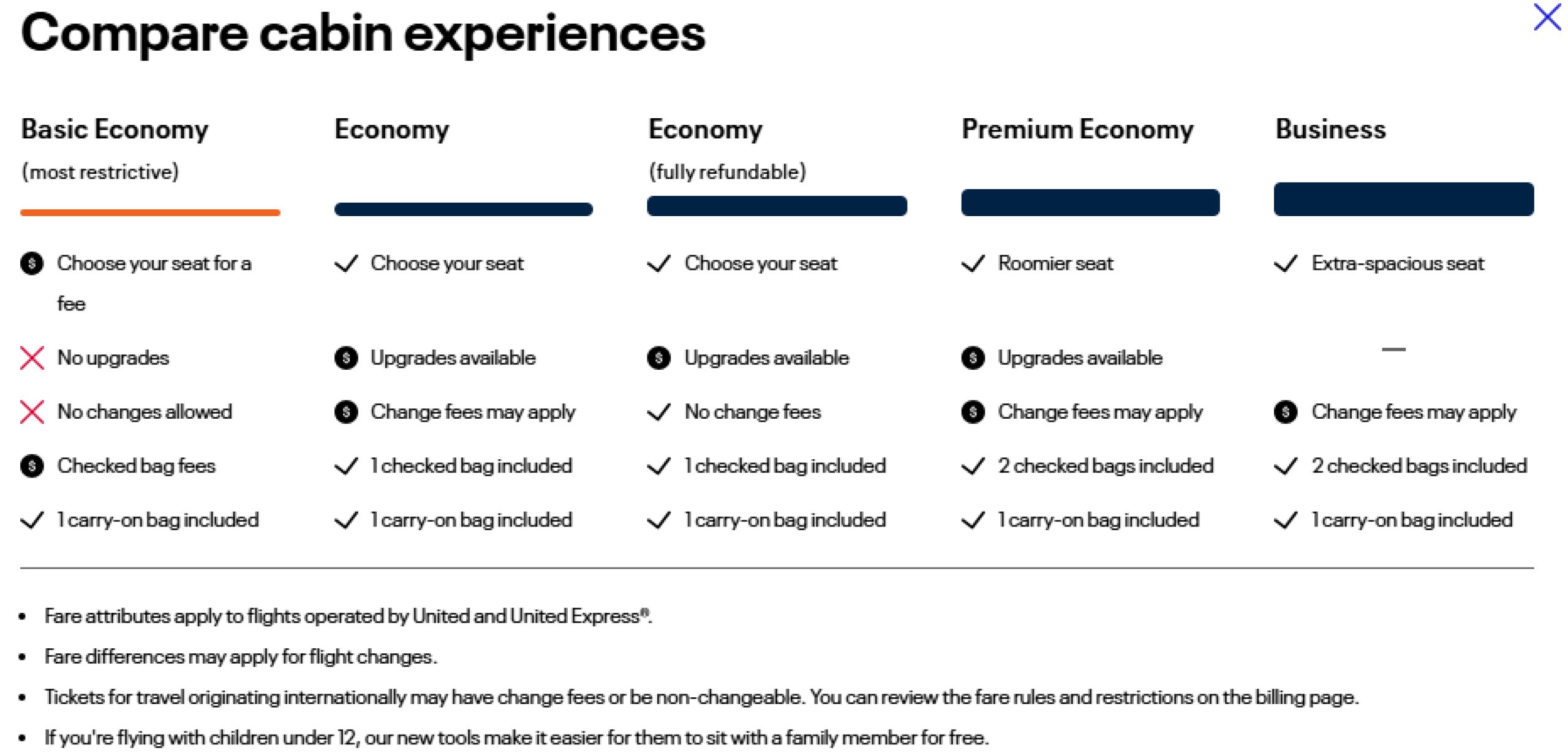 United tilbyr økonomiklasse, premium økonomiklasse og business-klasse på flyene sine. På innenriksruter og regionale ruter til Karibia og Sør-Amerika er business class-betegnelsen First Class.