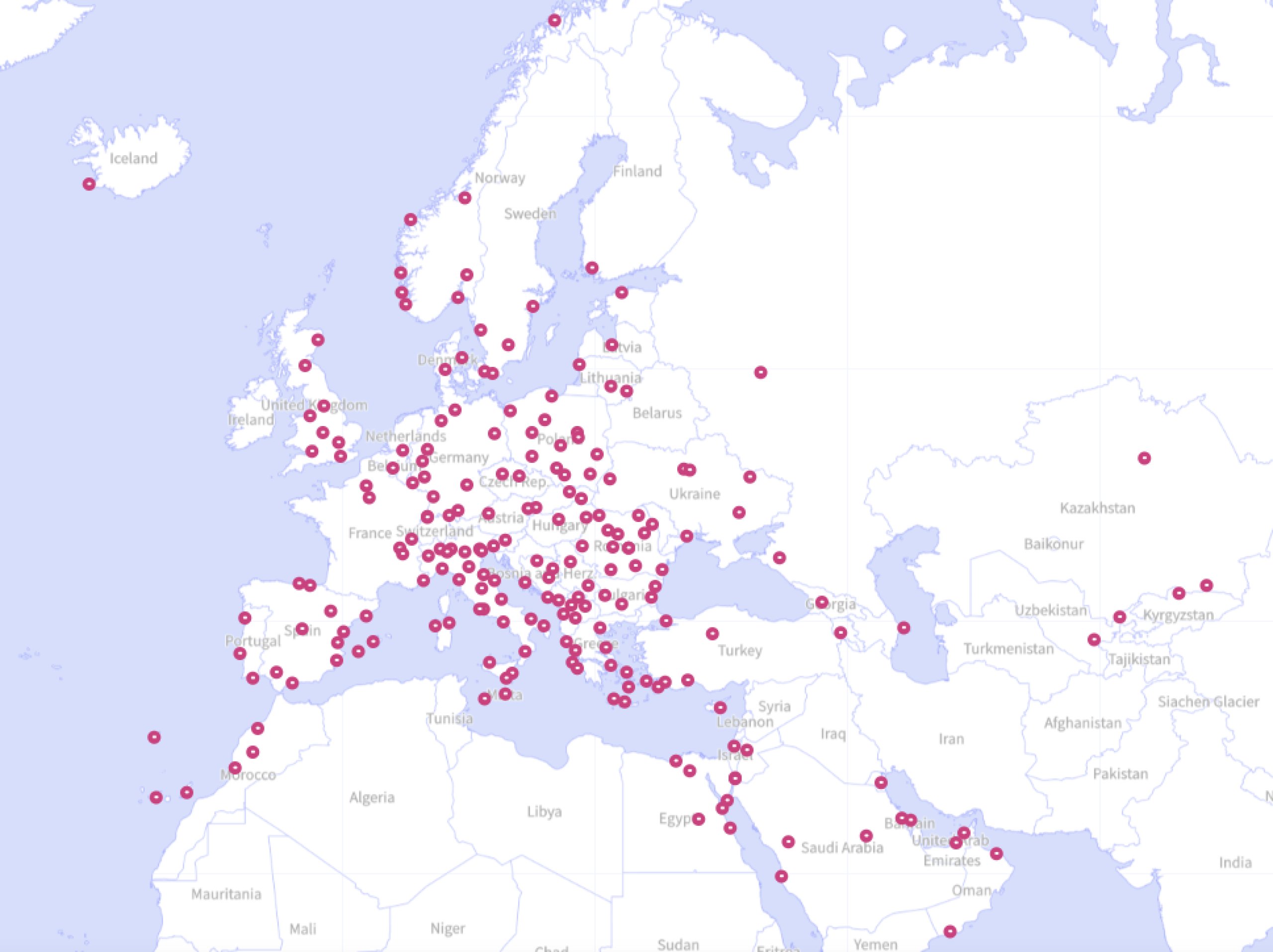 For et offisielt kart over alle ruter etter destinasjon, besøk wizzair.com/route-map eller kartet nedenfor.