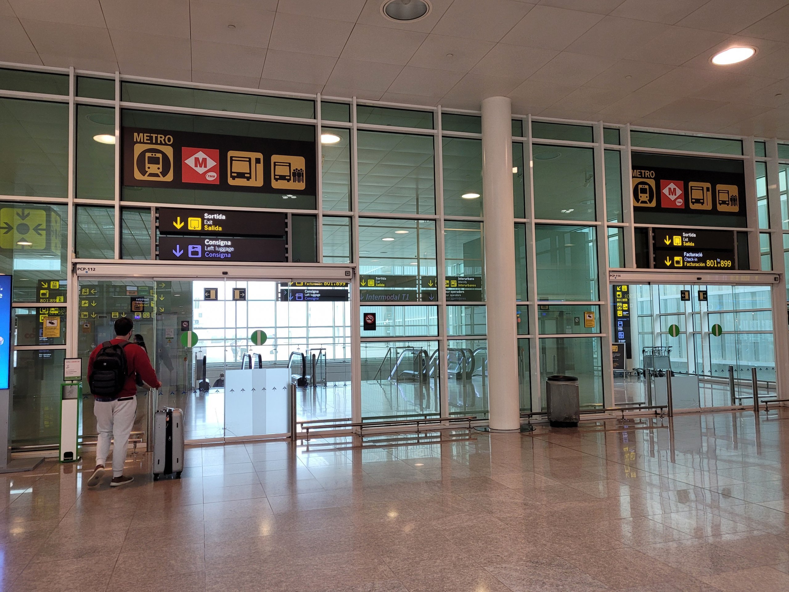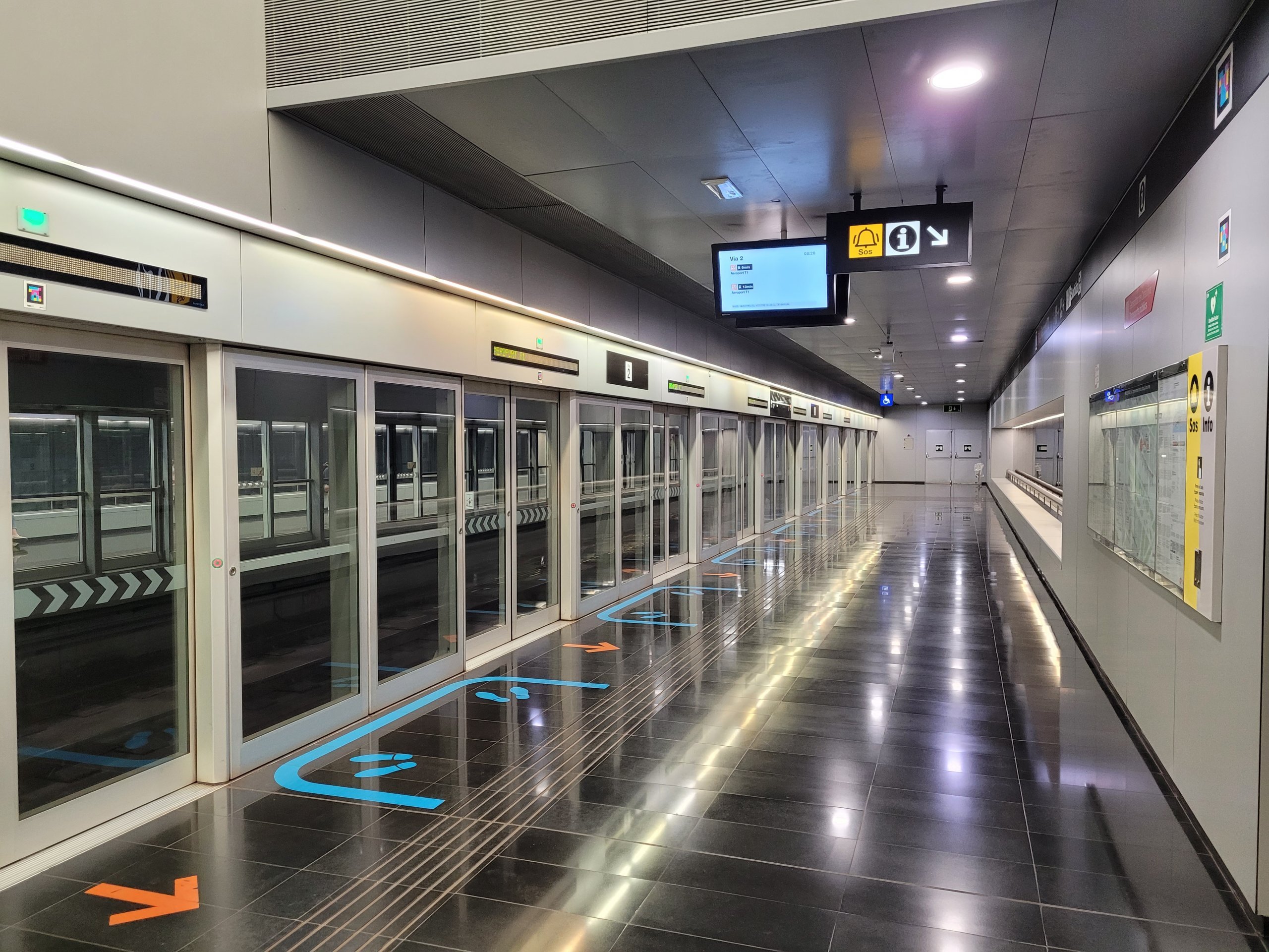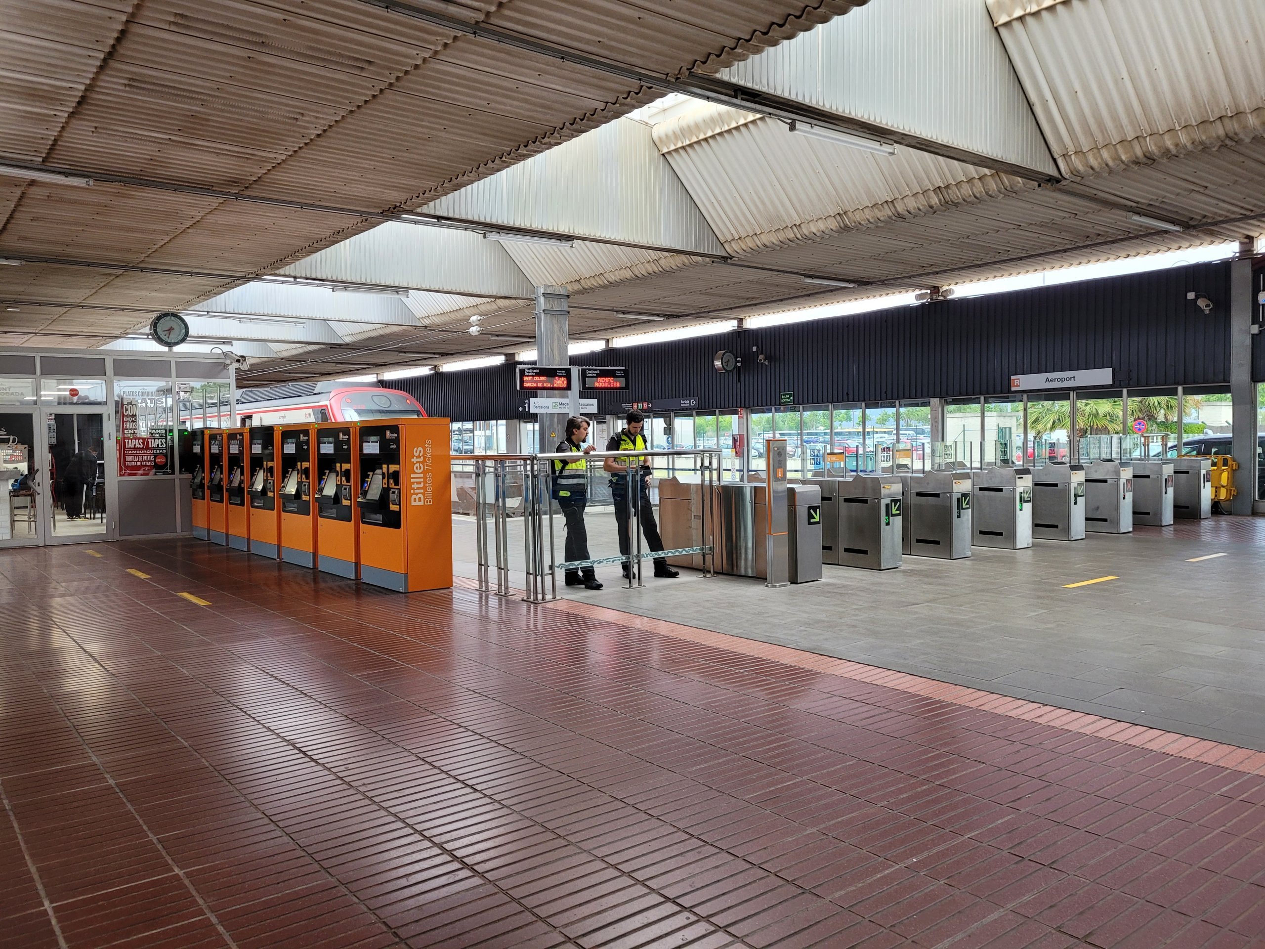 Når du kommer fra sentrum, er den første stasjonen på flyplassen "Aeroport T2" ved terminal 2, mens den siste stasjonen heter "Aeroport T1" og ligger ved terminal 1.