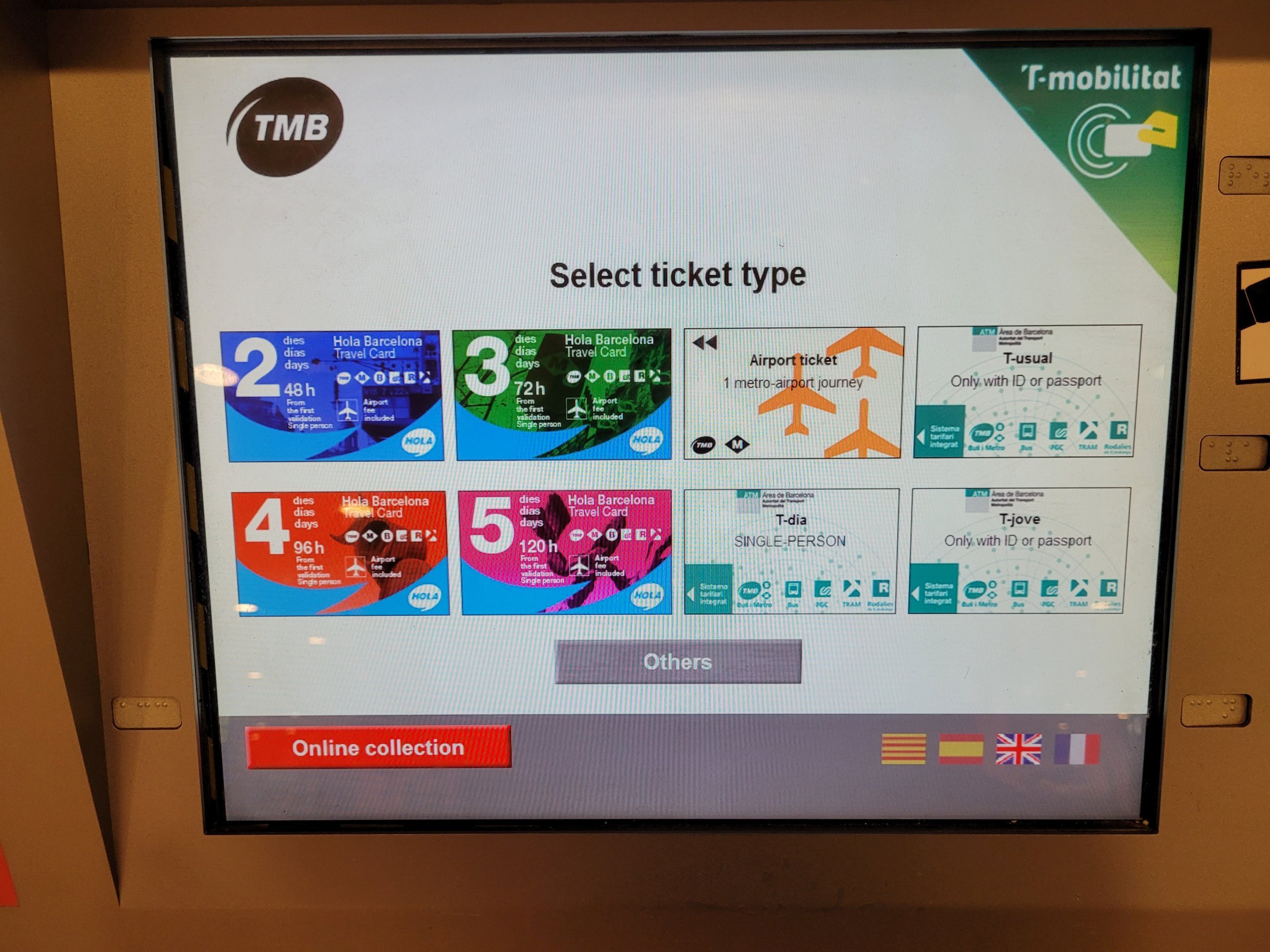 - Hola Barcelona-billetter kan kjøpes fra billettautomaten på metrostasjonen, eller med 10 % rabatt på nettet - i så fall vil du motta en kode i e-posten din som du kan bruke til å hente billetten din fra billettautomaten på metrostasjonen