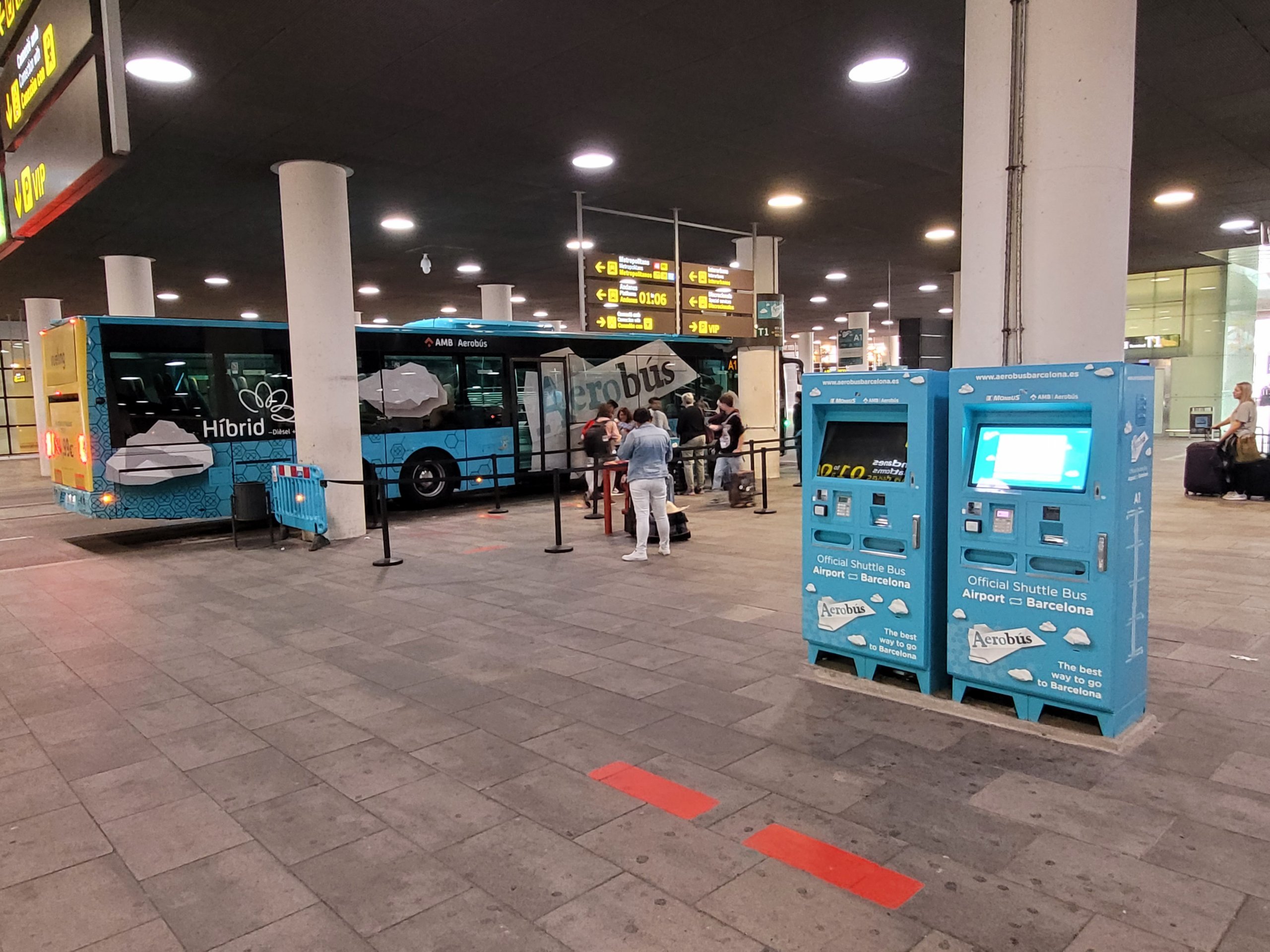 Aerobus kjører 2 ruter (A1 Pl. Catalunya - Terminal 1 og A2 Pl. Catalunya - Terminal 2). Ingen billetter til offentlig transport i Barcelona er gyldige for denne bussen. Du kan kjøpe spesialbilletter på nettet på aerobusbarcelona.es eller i de blå automatene ved bussholdeplassen.