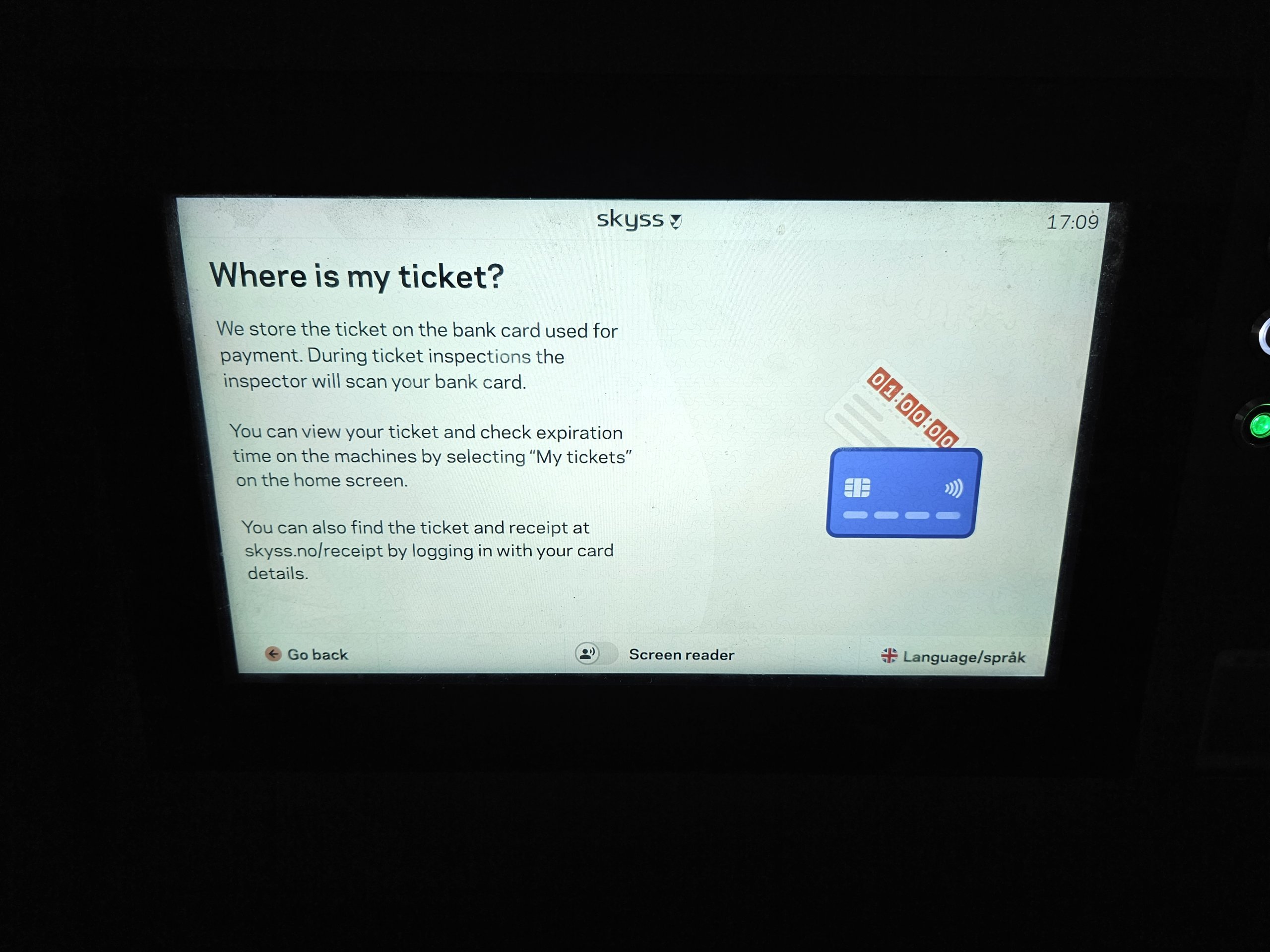 Automaten utsteder ingen papirbillett eller kvittering. Billetten lastes inn på debet- eller kredittkortet ditt når du kjøper den fra automaten, og ved kontroll viser du bare frem det kontaktløse kortet ditt, som også kan være på mobiltelefonen/klokken din.
