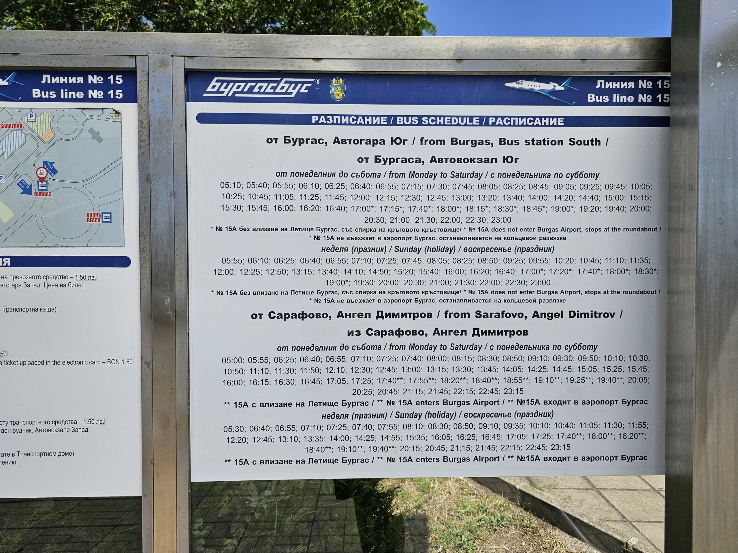 Hvis du er på vei fra flyplassen til Burgas sentrum mellom kl. 17.40 og 19.40, er holdeplassen mot sentrum rett utenfor terminalen. På andre tider av døgnet er holdeplassen mot sentrum ved rundkjøringen.