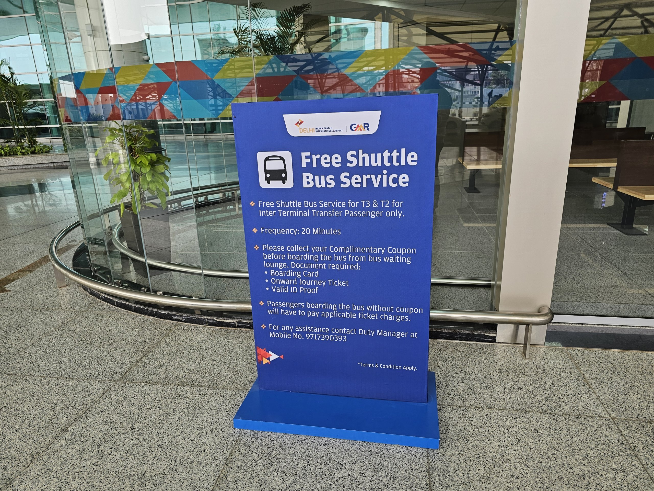 Du finner offisiell informasjon om busstilbudet mellom terminalene på flyplassens nettsted: newdelhiairport.in/inter-terminal-transports.