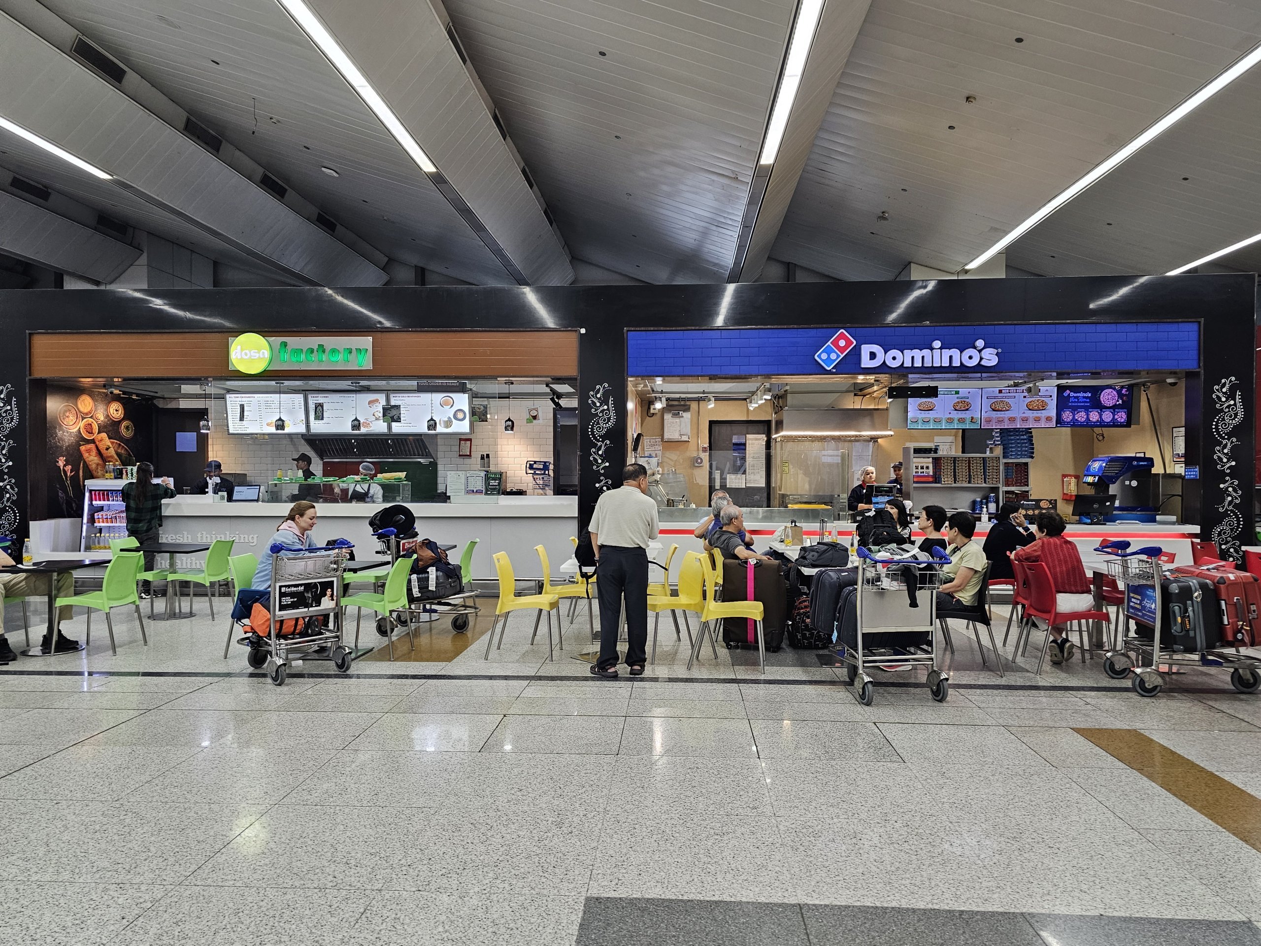 Hvis du går inn i terminalen, er det nesten ingen matalternativer i det offentlige området, og du kan tidligst komme deg gjennom sikkerhetskontrollen fire timer før en utenlandsflyvning og tre timer før en innenlandsflyvning.