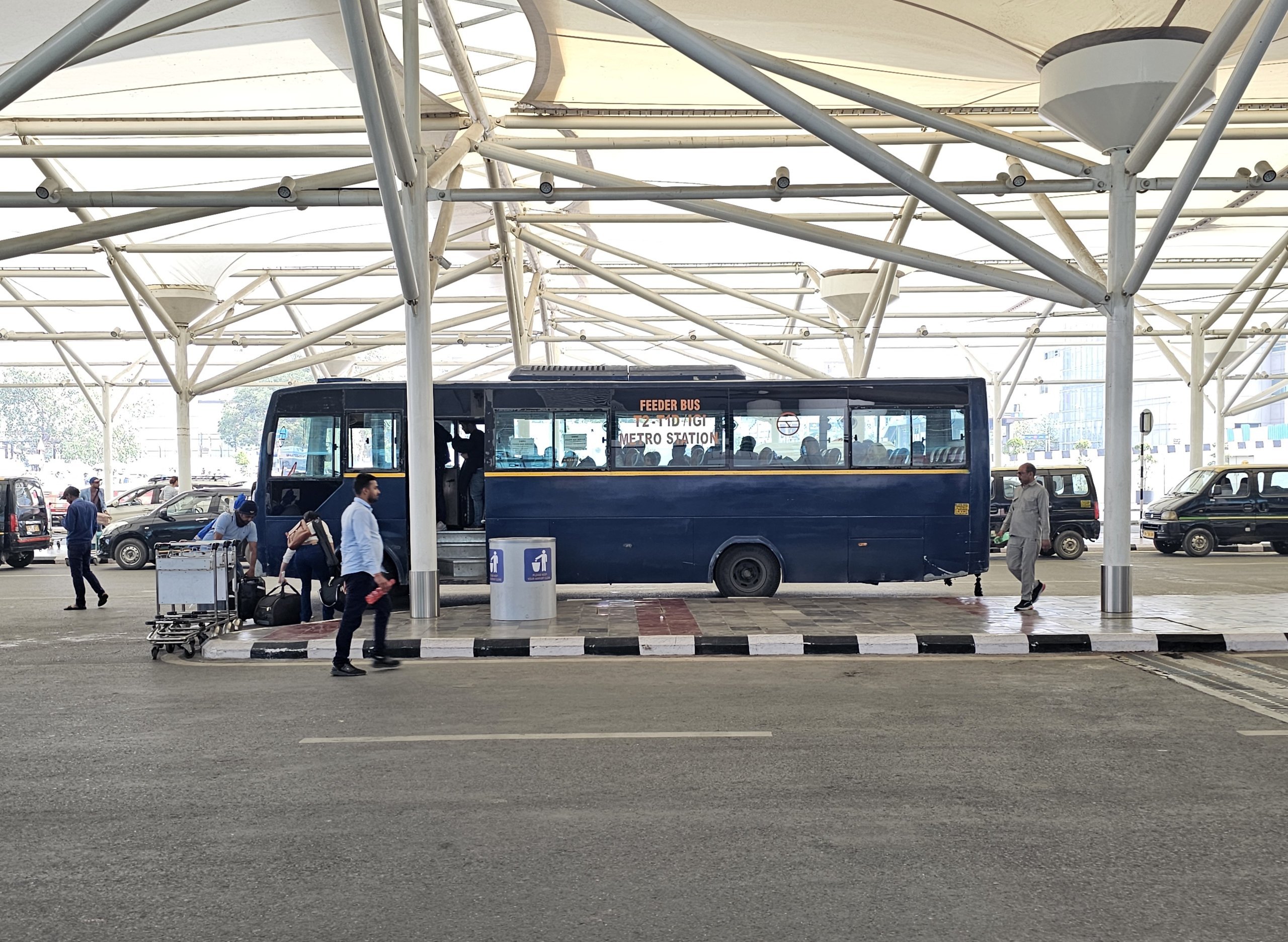 En spesiell skyttelbuss kjører mellom terminal 1 og Aerocity metrostasjon, der den mye raskere metroen "Airport Express" stopper, hvert 15. minutt fra kl. 06.00 til 23.00.