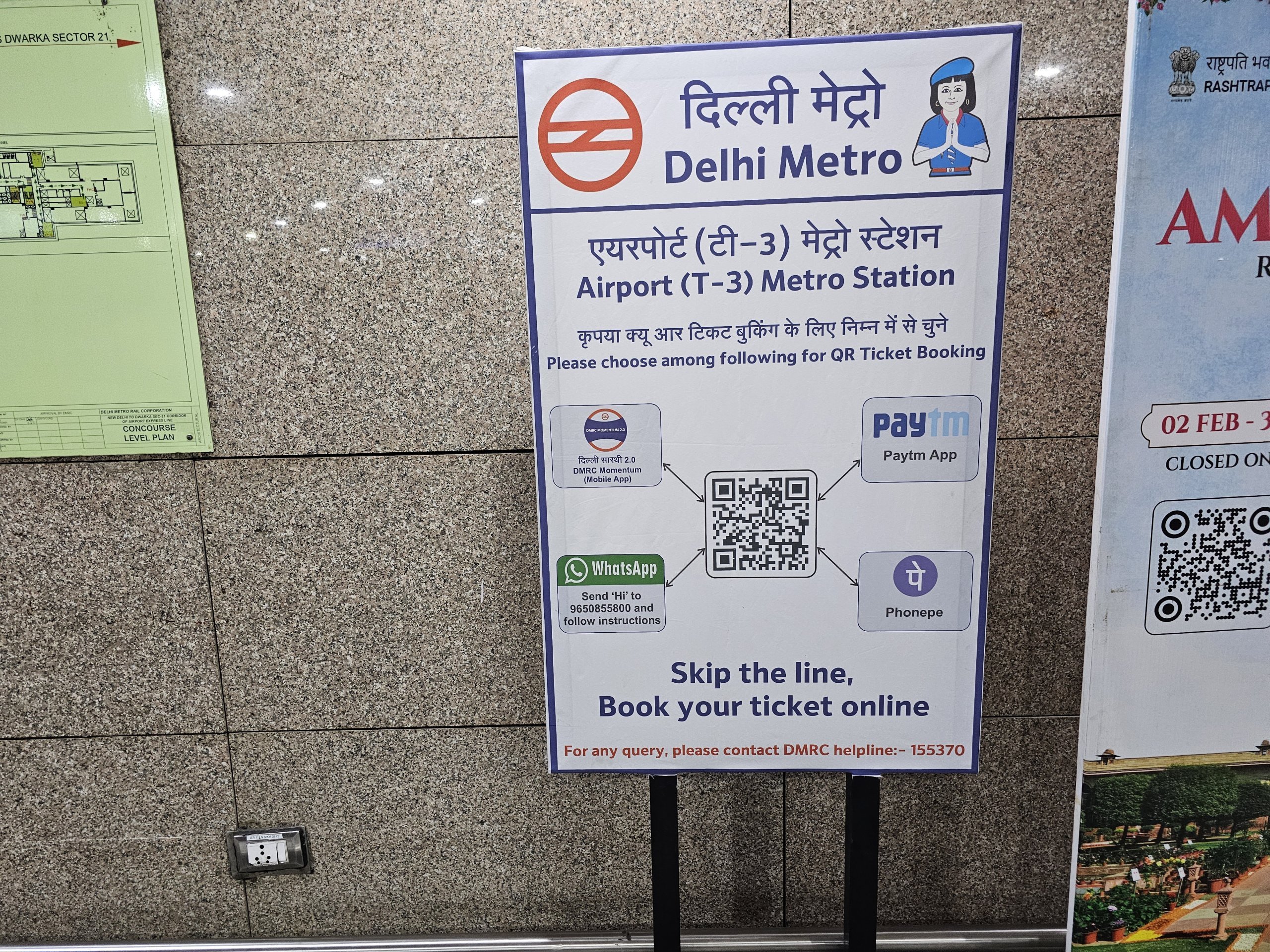 Billetter kan nå også betales med QR-kode via DMRC Travel App (tilgjengelig på Google Play / App Store). Det kreves imidlertid registrering med personlige opplysninger. Via denne appen kan du betale billetter for alle Delhi-metrolinjene, bortsett fra den oransje "Airport Express" som går til terminal 2 og 3 (se info ovenfor).
