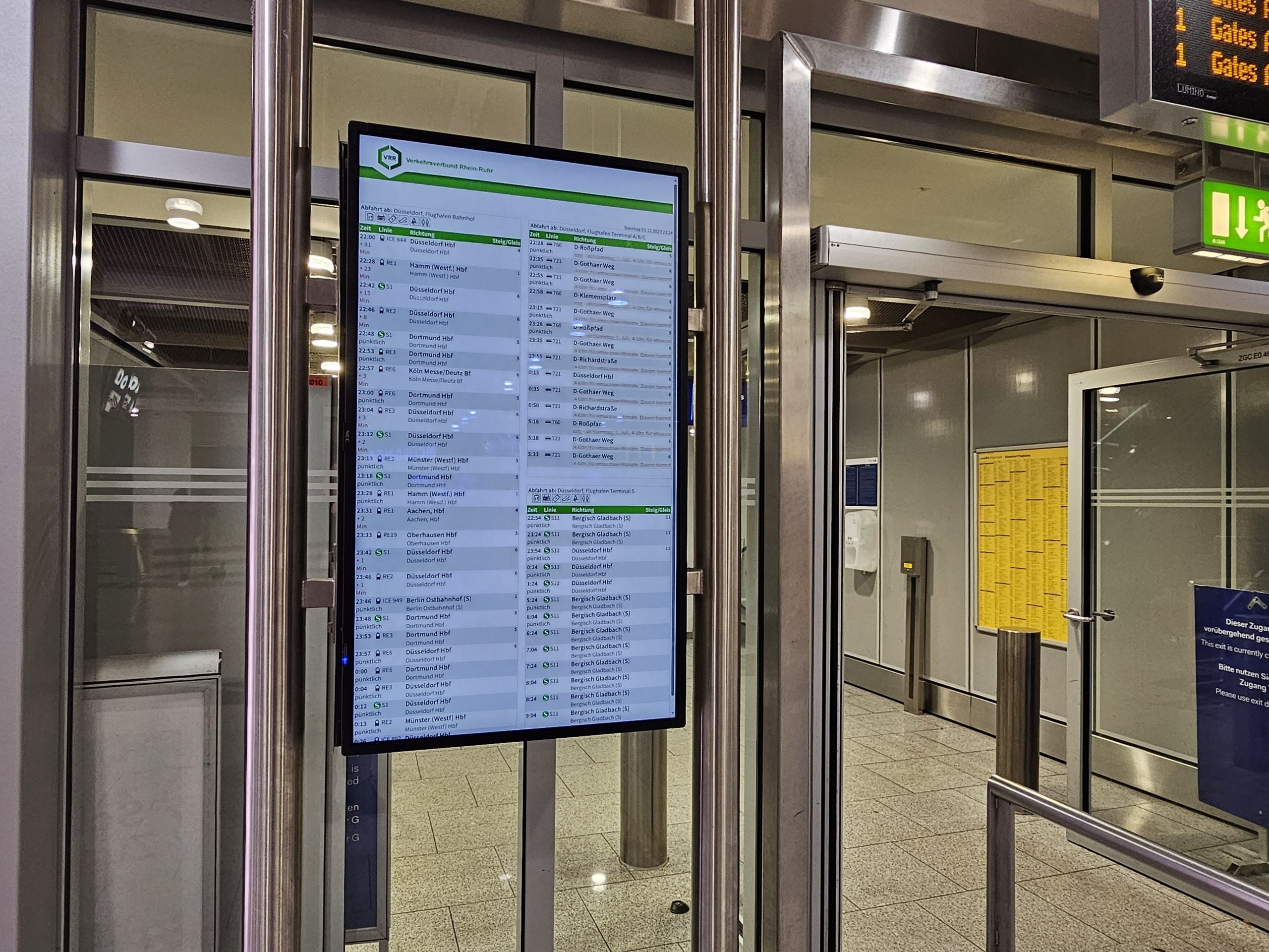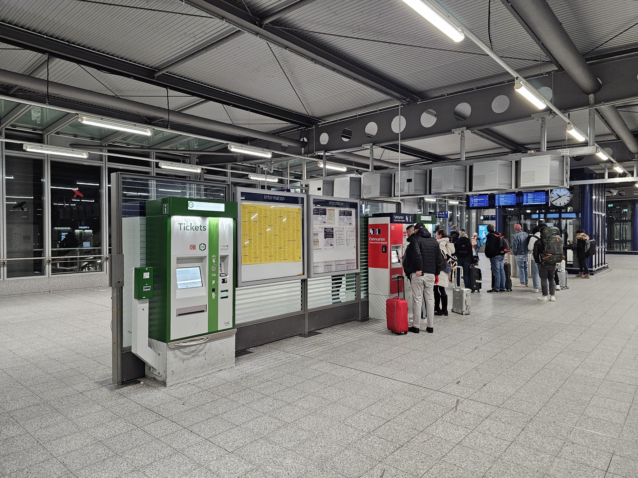 Før du forlater flyplassterminalen, kan du sammenligne de aktuelle avgangene for alle avgangene på den interaktive avgangstavlen og se om det lønner seg å ta automattoget til togstasjonen eller om du heller vil ta S-Bahn S11 direkte fra terminalen.