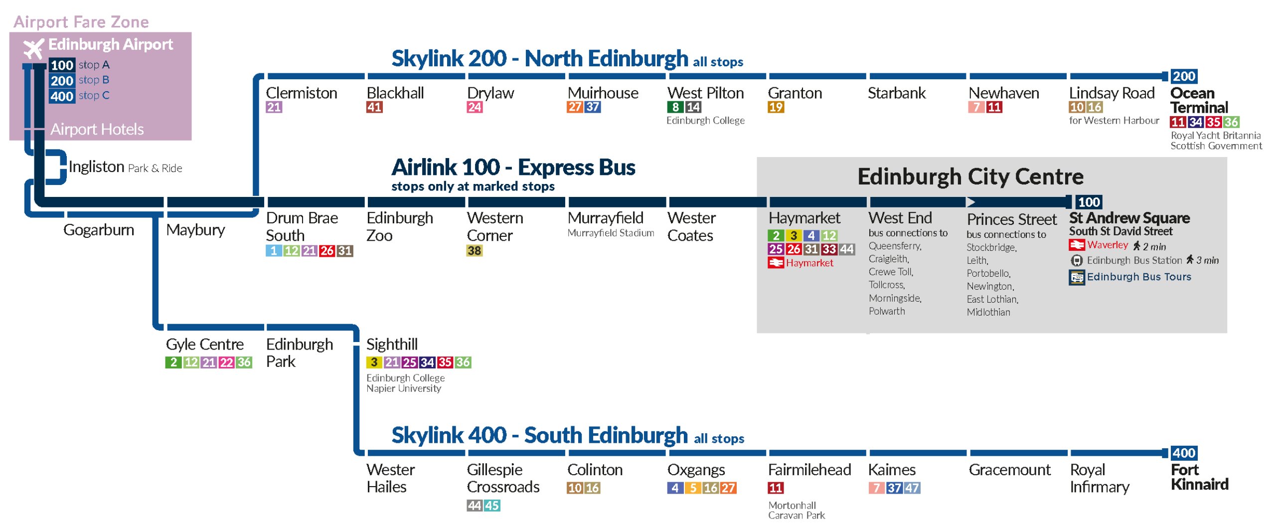 Edinburgh betjenes av tre bussruter og én trikk. Den billigste transporten er bussene til 6 gbp, den raskeste trikken til 7,90 gbp.