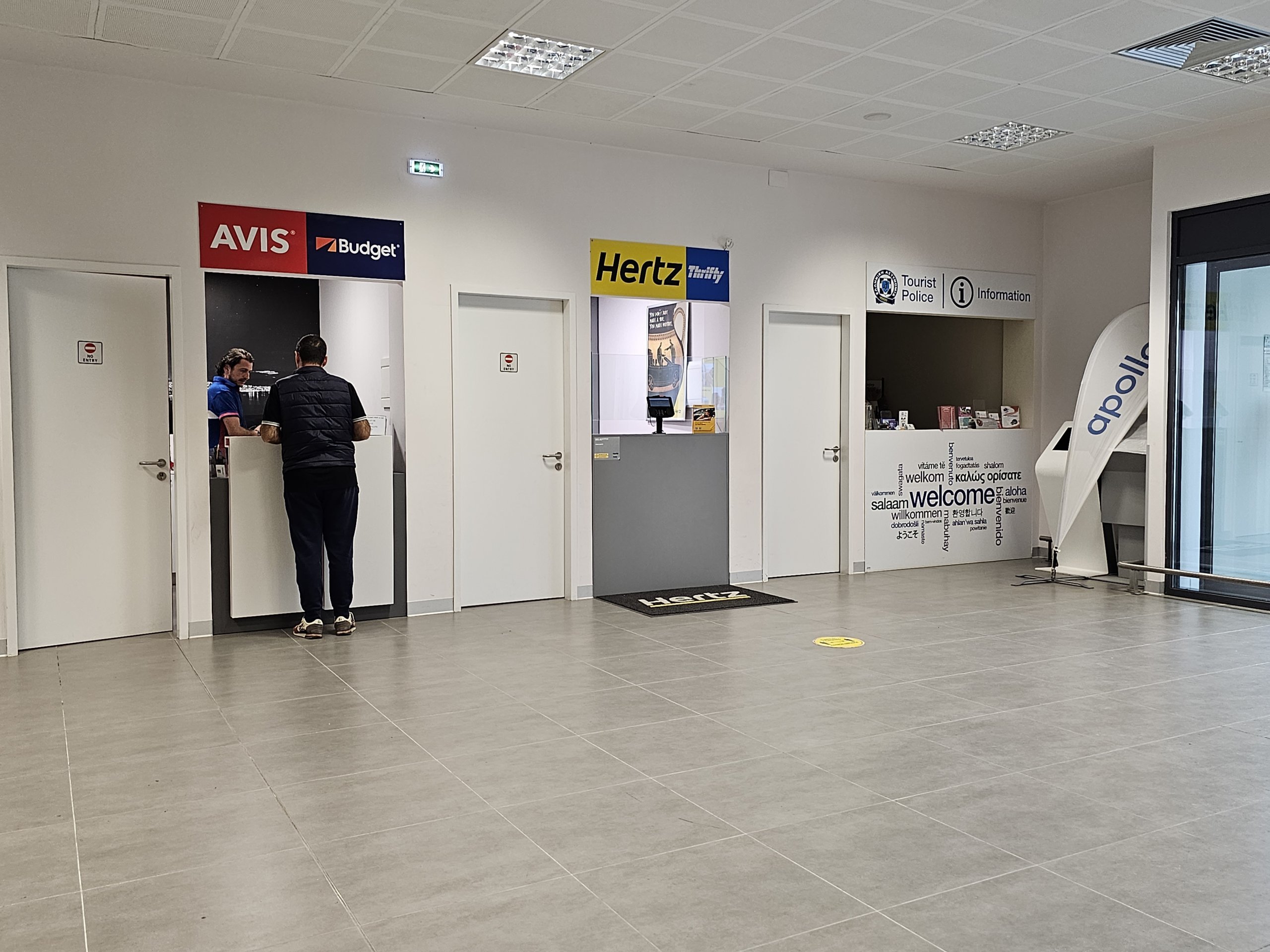 Flere store internasjonale bilutleiefirmaer har en skranke i ankomsthallen. Bil er praktisk talt det eneste relevante transportmiddelet for å utforske den greske landsbygda.