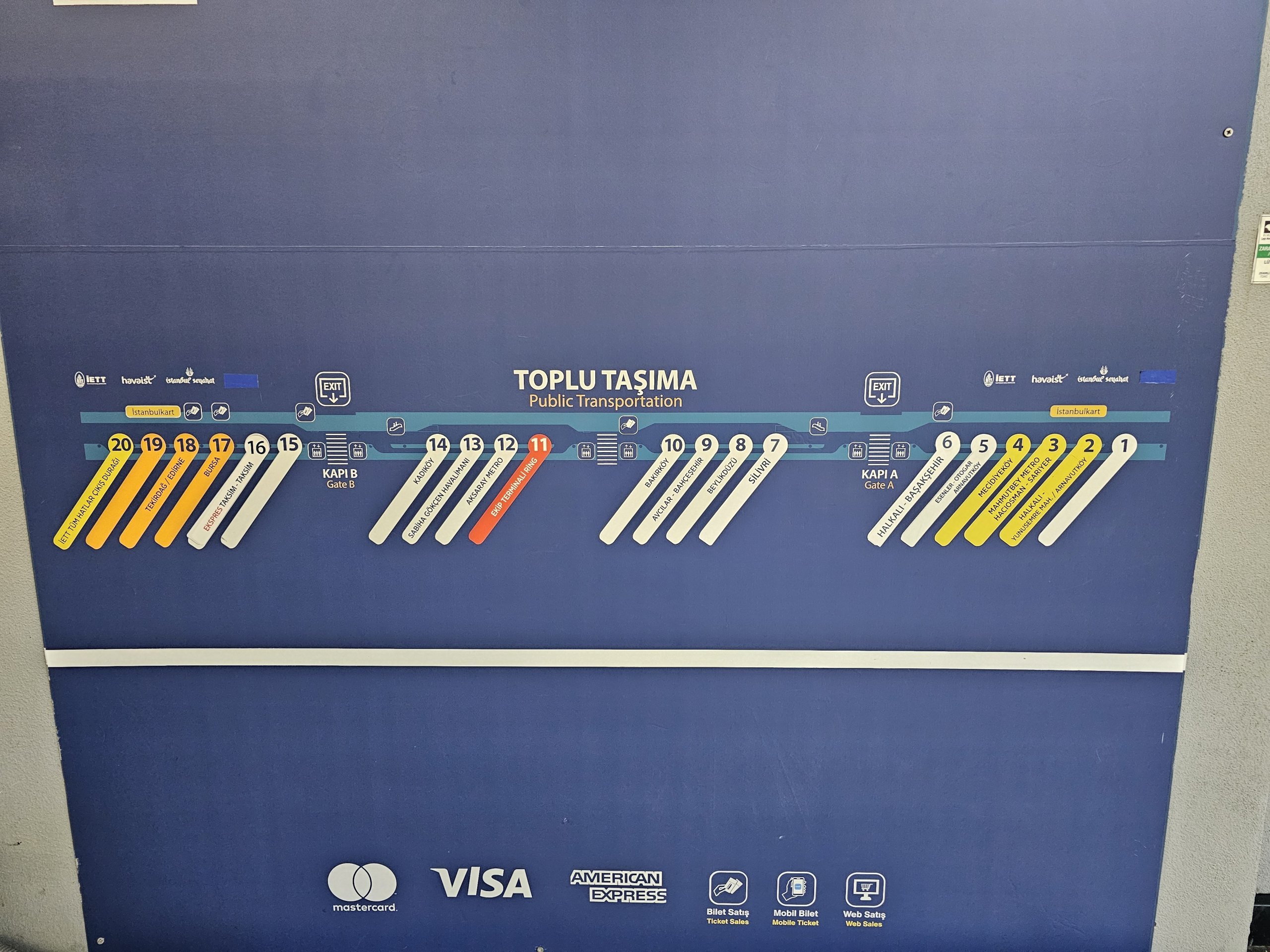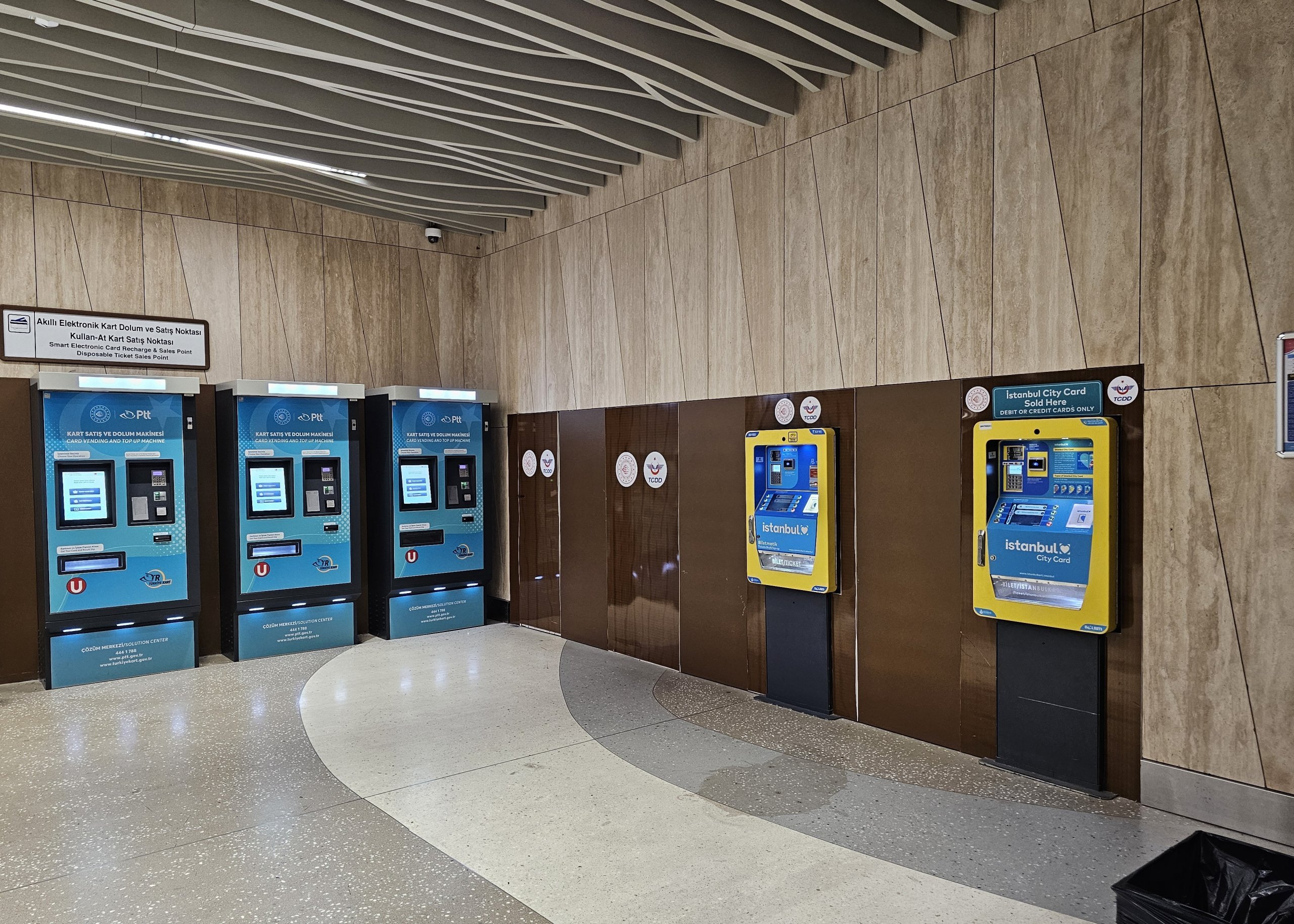 - Blå "PTT" -automat - selger PTT-transportkort som kun er gyldige for M11-linjen og ikke kan brukes til transport på andre t-baner eller busser i Istanbul