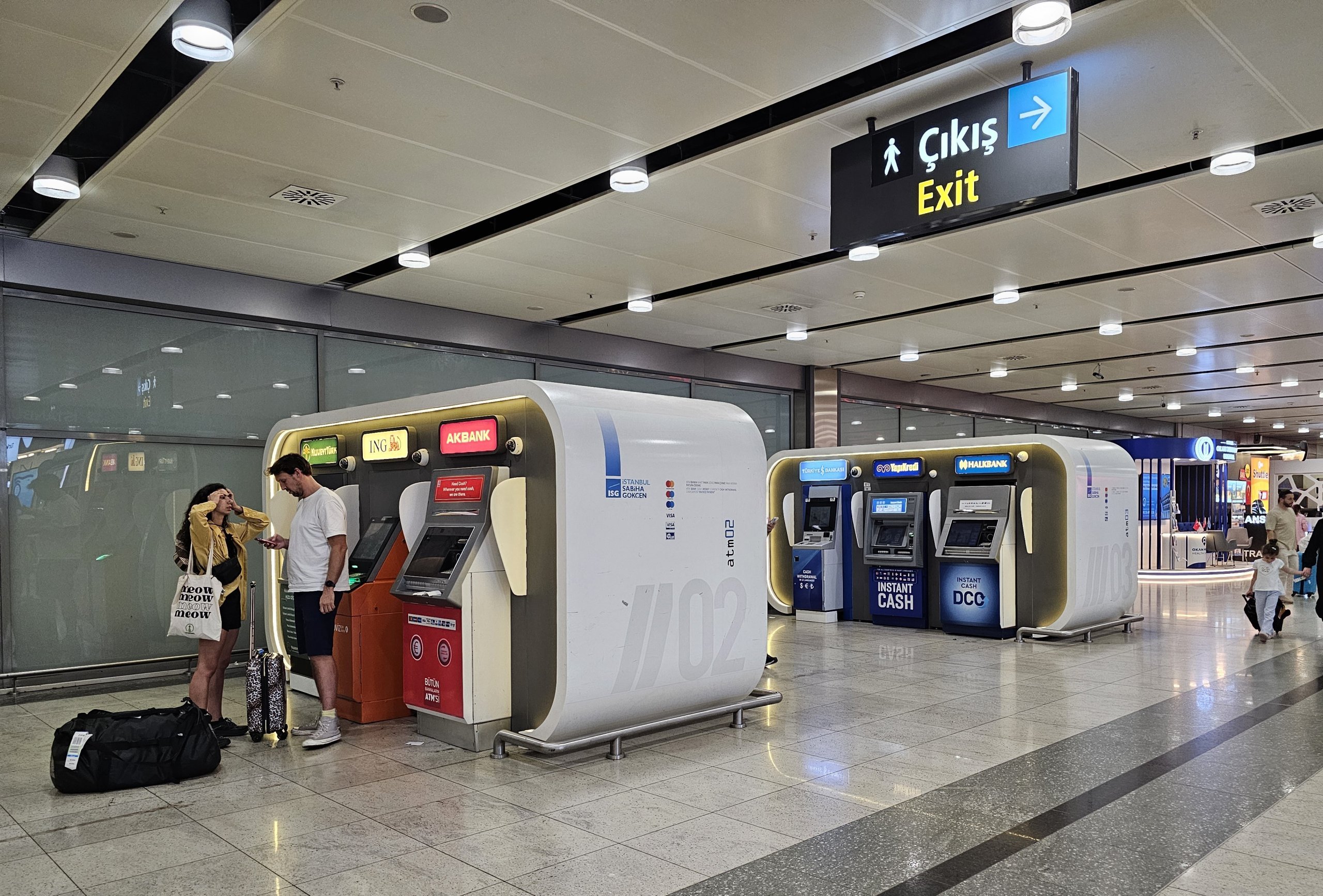 Minibanker fra de vanlige tyrkiske bankene finnes i stort antall i ankomsthallen og i korridoren til metrostasjonen.