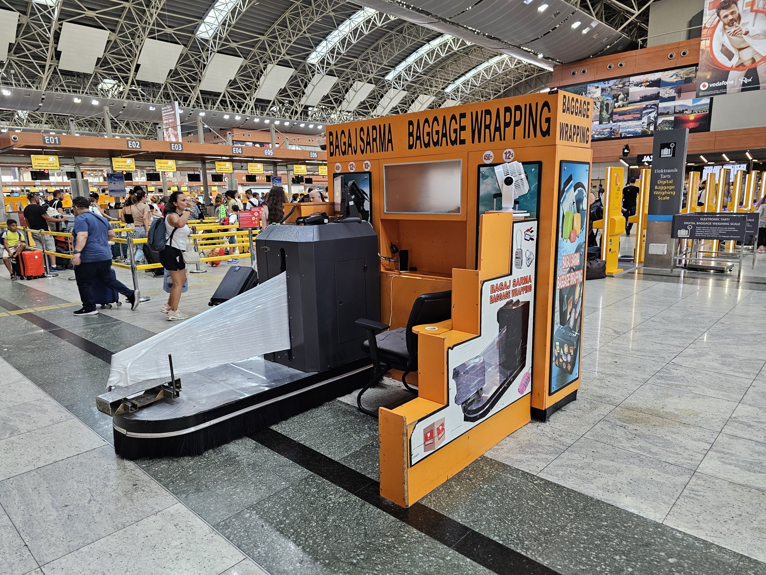 Det finnes flere kiosker i avgangshallen der du kan få bagasjen pakket inn i beskyttelsesfilm mot en avgift på 10 euro.