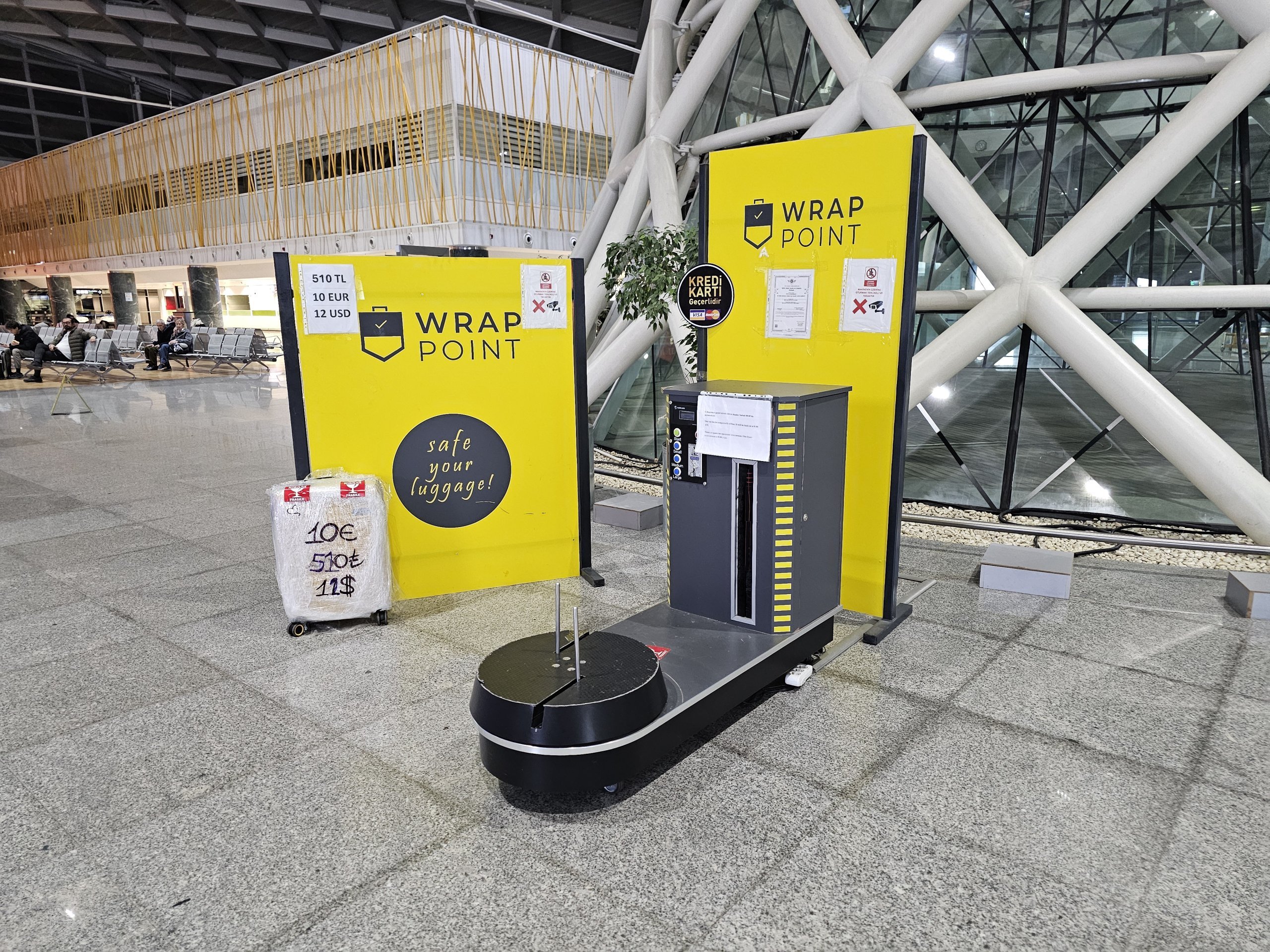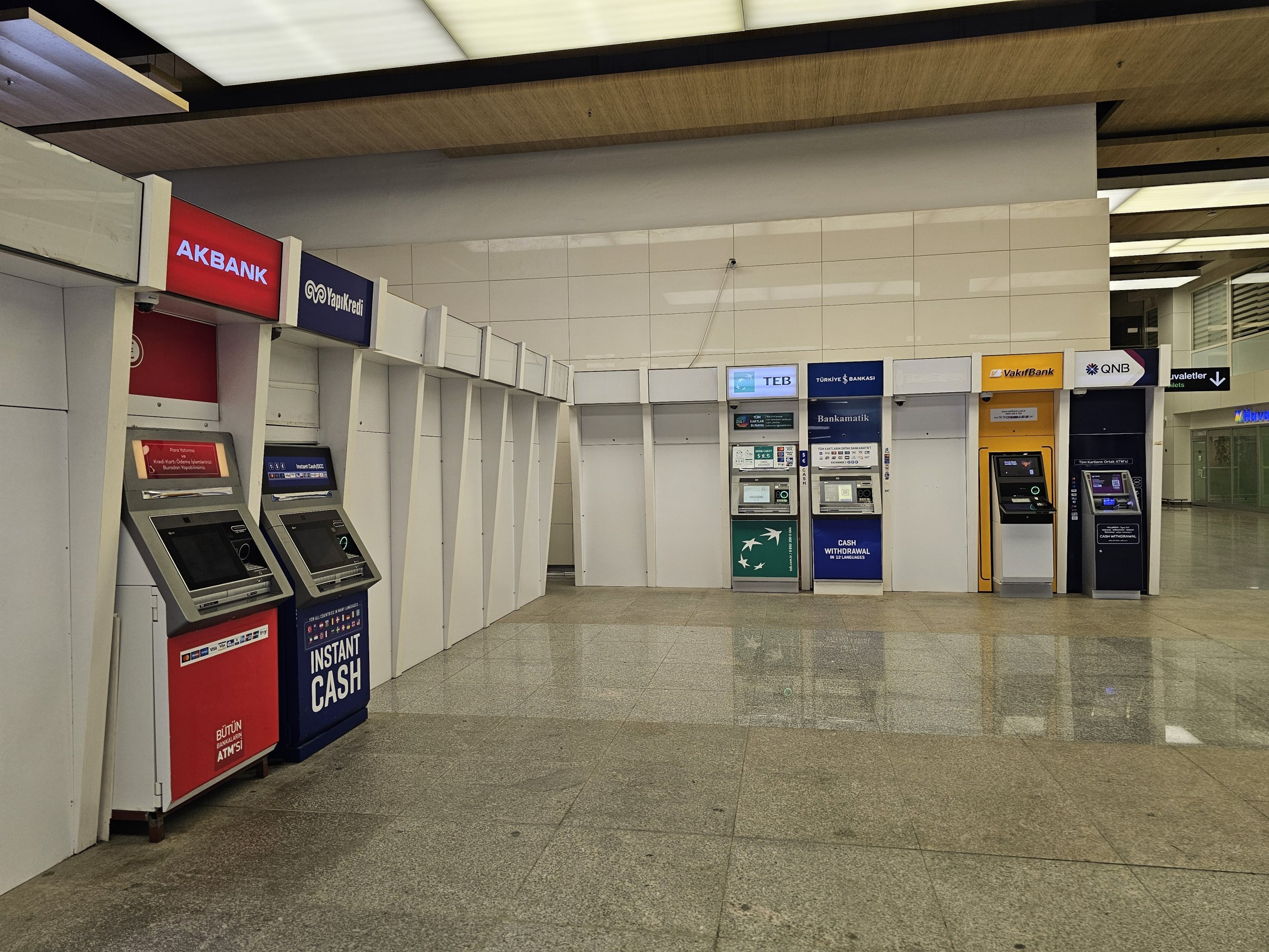 Minibanker fra de vanlige tyrkiske bankene er plassert mange steder i ankomsthallene på begge terminalene.