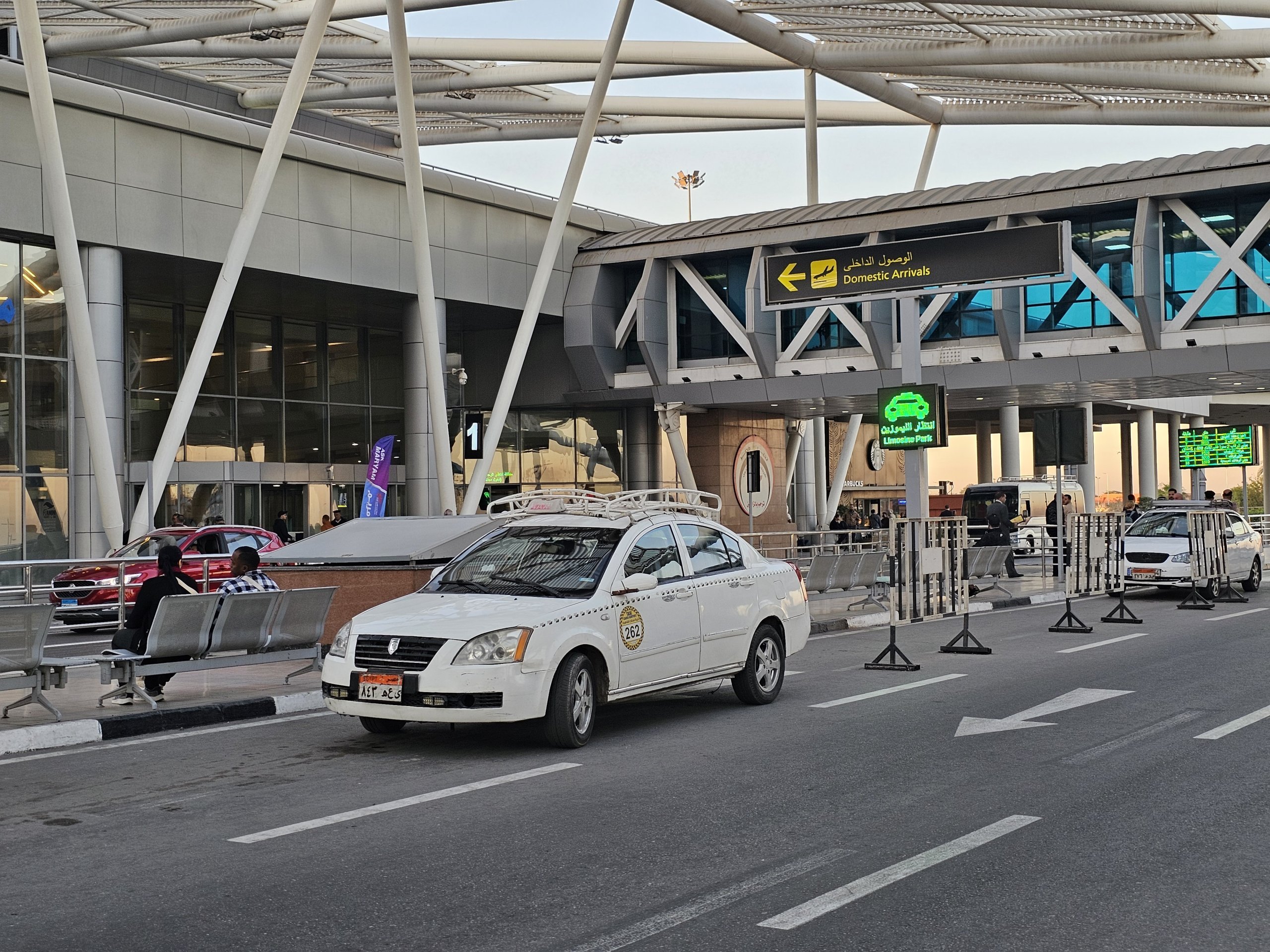 Offisielle, hvite drosjer finnes overalt på flyplassen og i Kairo til alle døgnets tider.