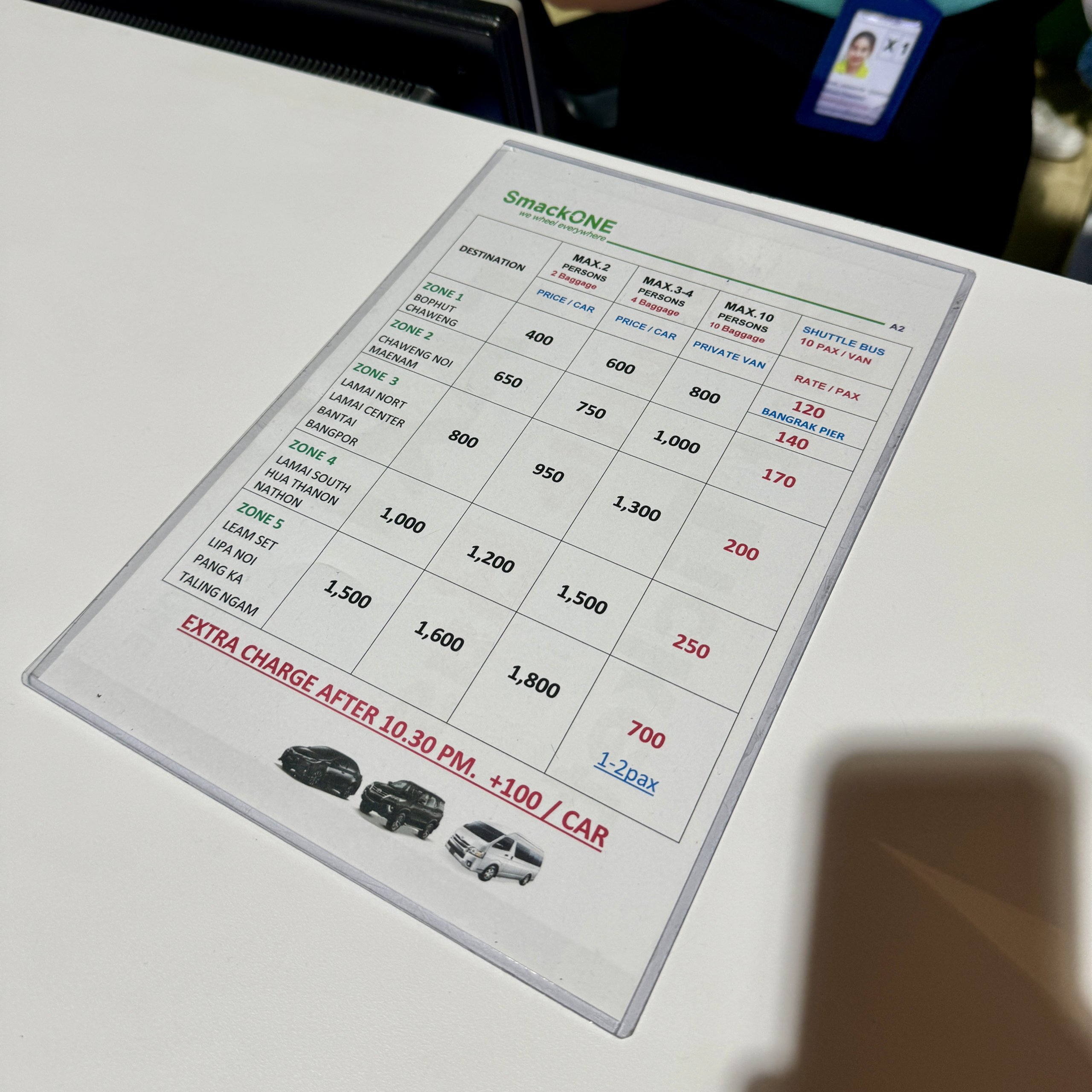 Ved avreise etter kl. 22.30 påløper en ekstra avgift på 100 thb per bil.