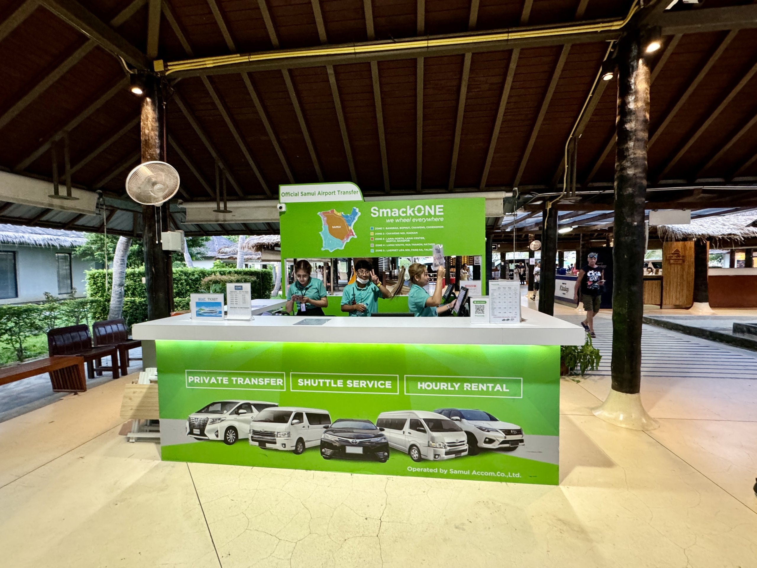 Det finnes også minibusser fra rederier til fergekaiene hvor du kan fortsette til øyene Koh Phangan og Koh Tao, som ikke har egen flyplass.