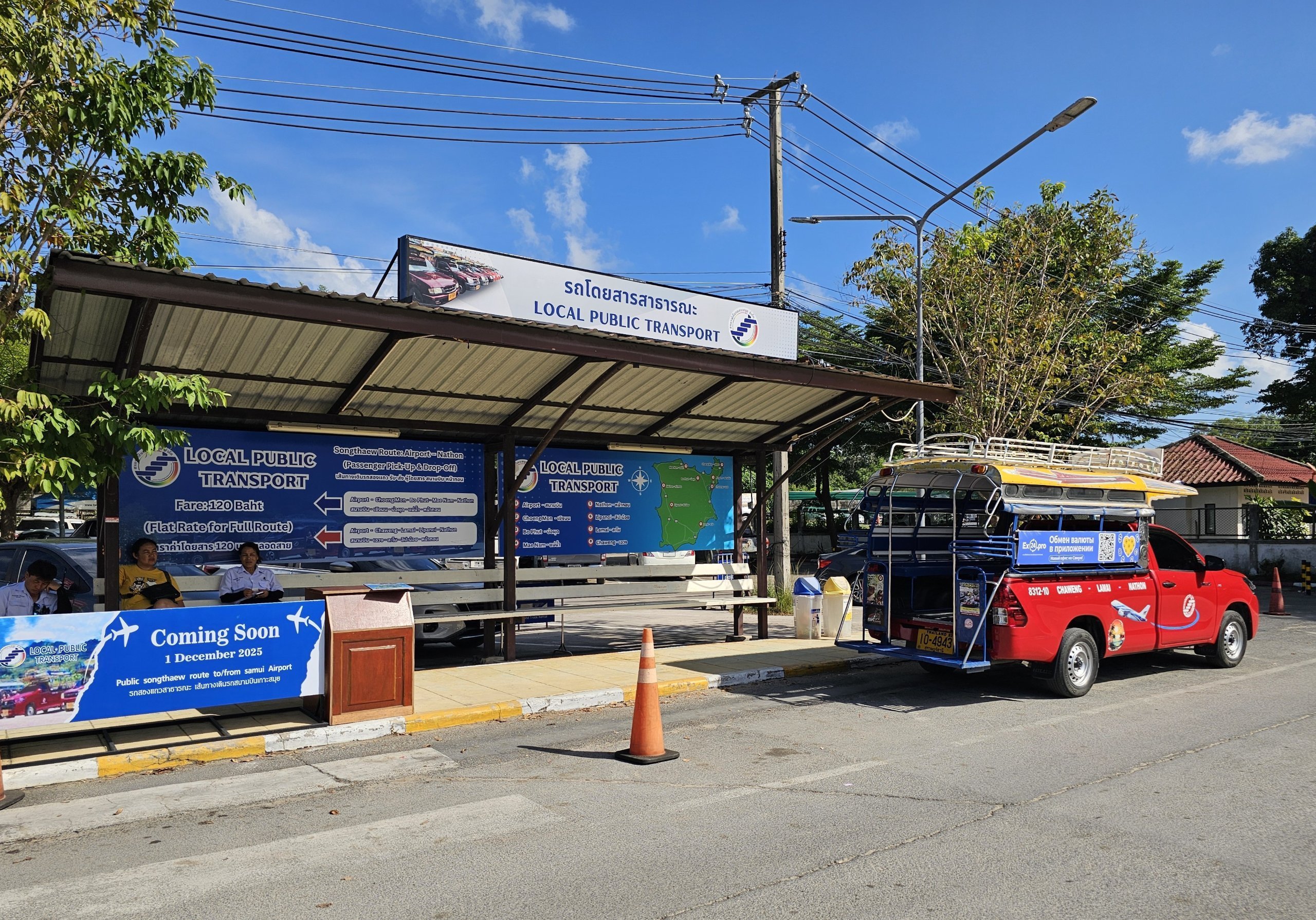 Songthaews forlater flyplassen hvert 30. minutt. I retning av flyplassen er frekvensen mindre presis, da det er svært hyppige trafikkork.