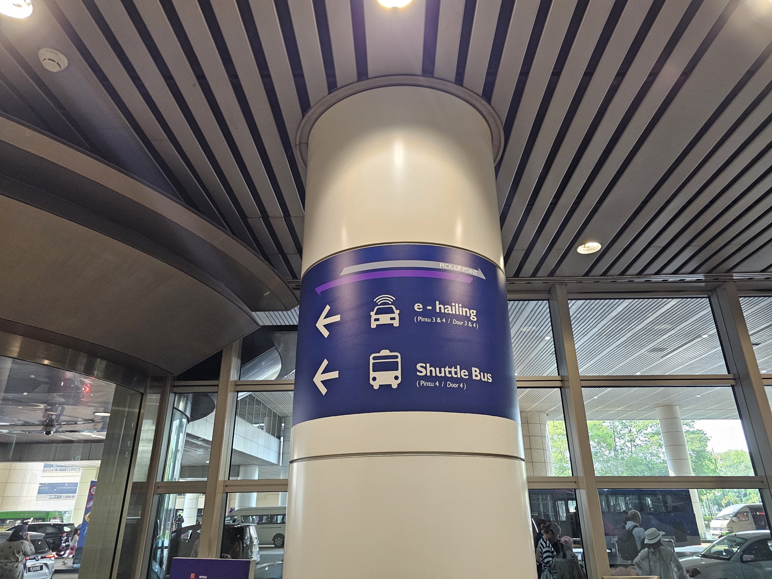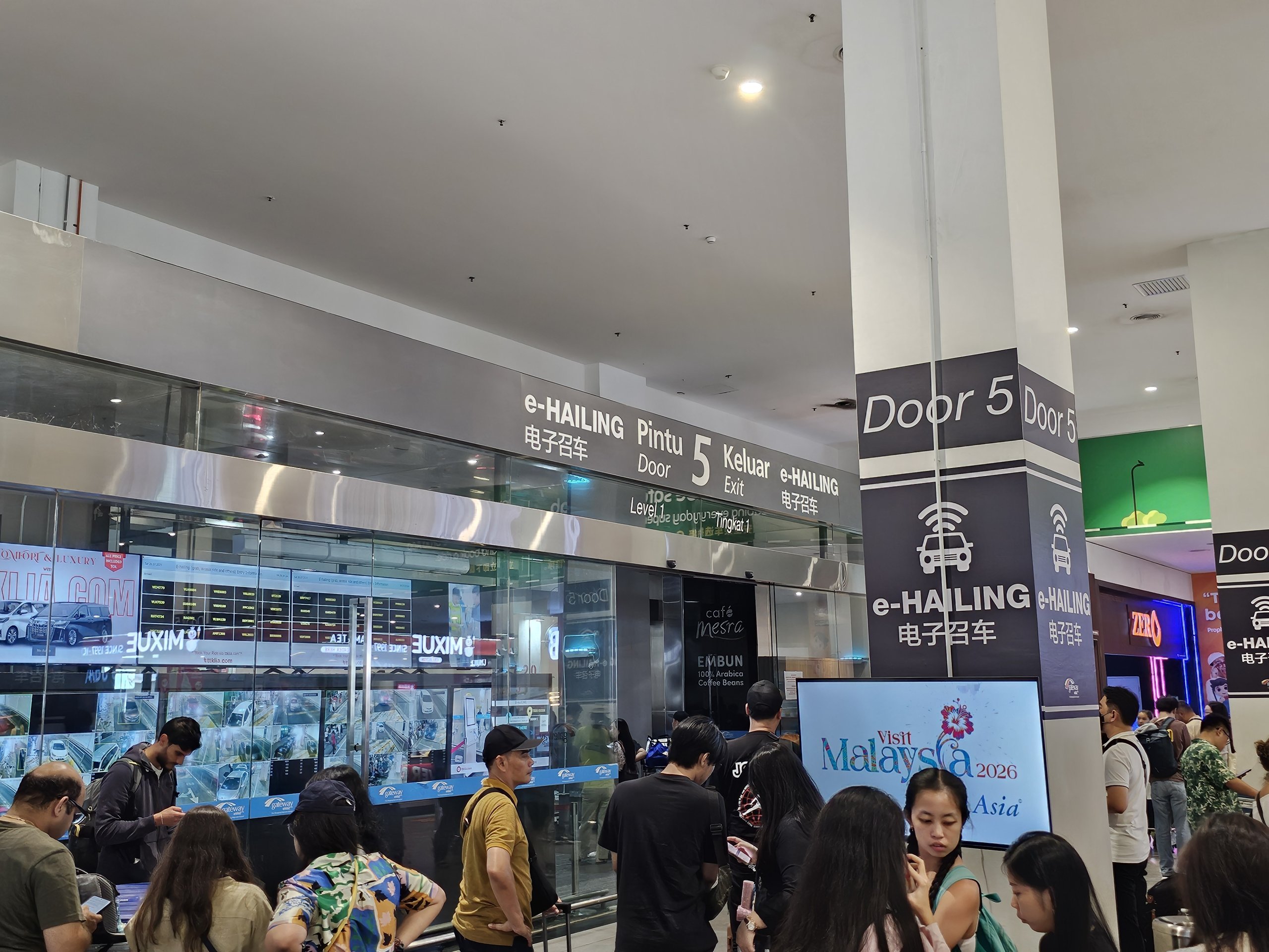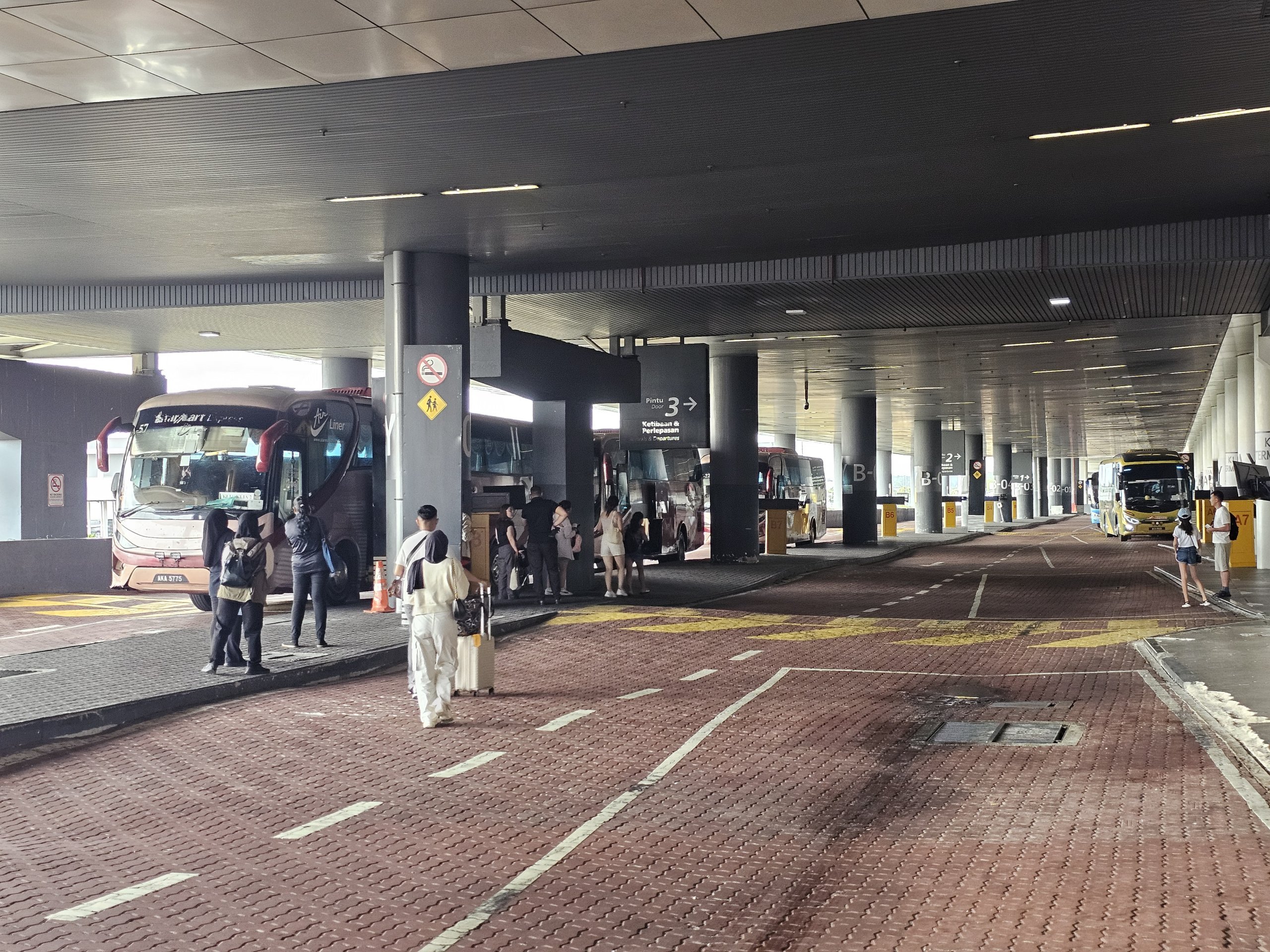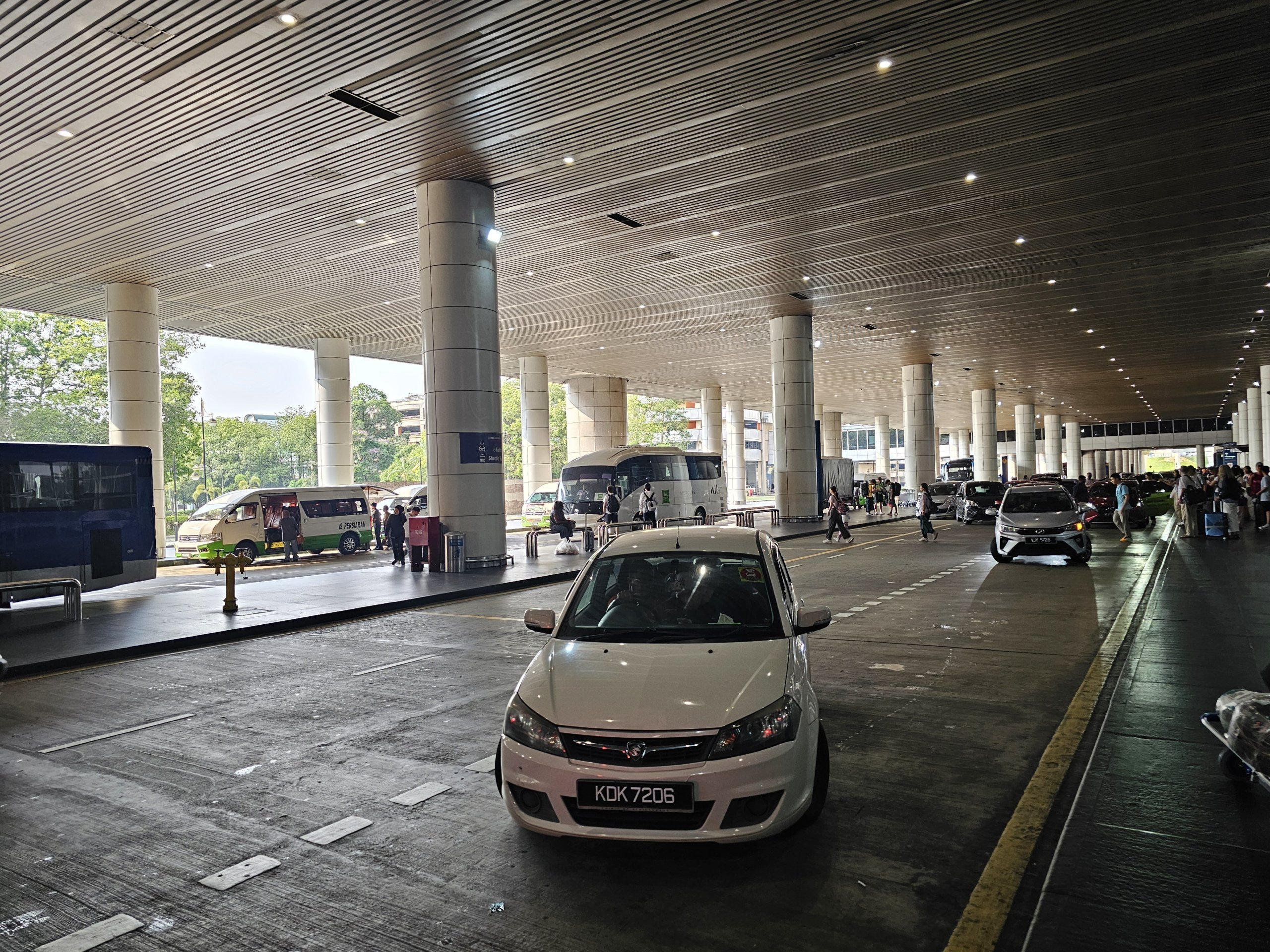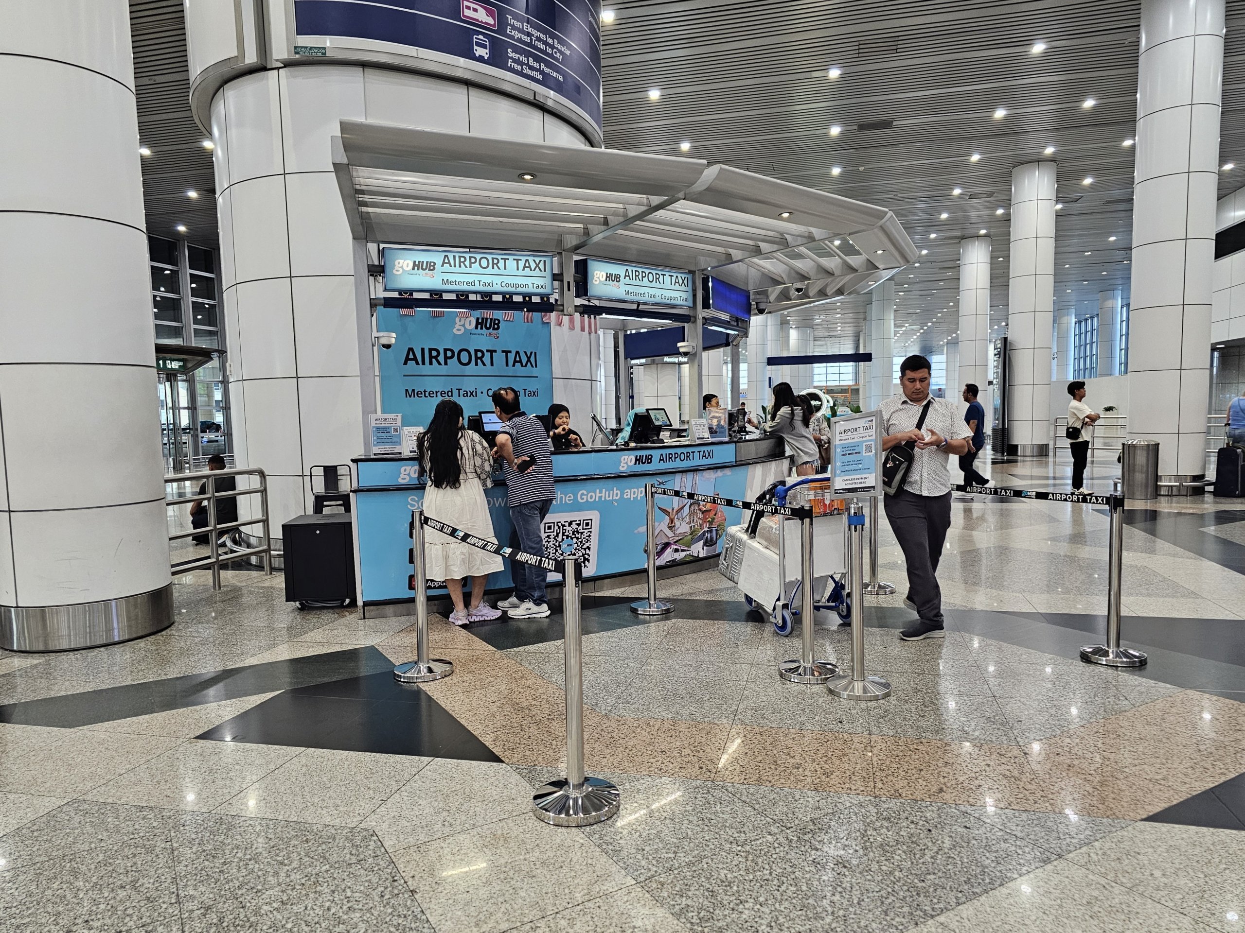 Den vanlige taxiholdeplassen er alltid på ankomstplanet, mens Grab har holdeplasser ved begge terminalene, to etasjer nede ved bussholdeplassene.