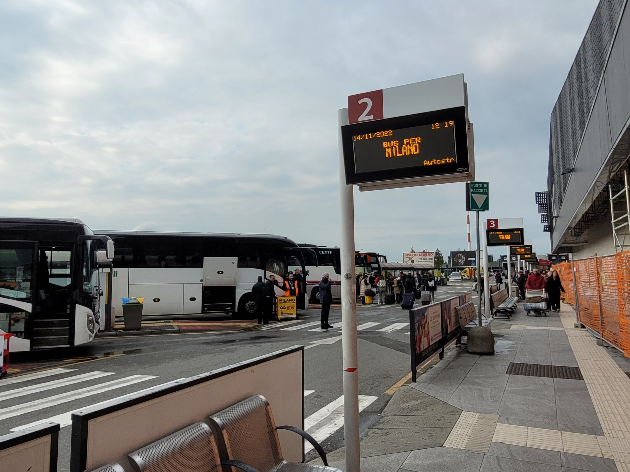 Transporten fra Bergamo lufthavn til Malpensa lufthavn (både terminal 1 og 2) kan gjøres på under to timer. Det går faktisk en direkte Flixbus-buss mellom flyplassene for 20 euro i én retning. Den har imidlertid bare 6-8 avganger om dagen fra plattform 3.