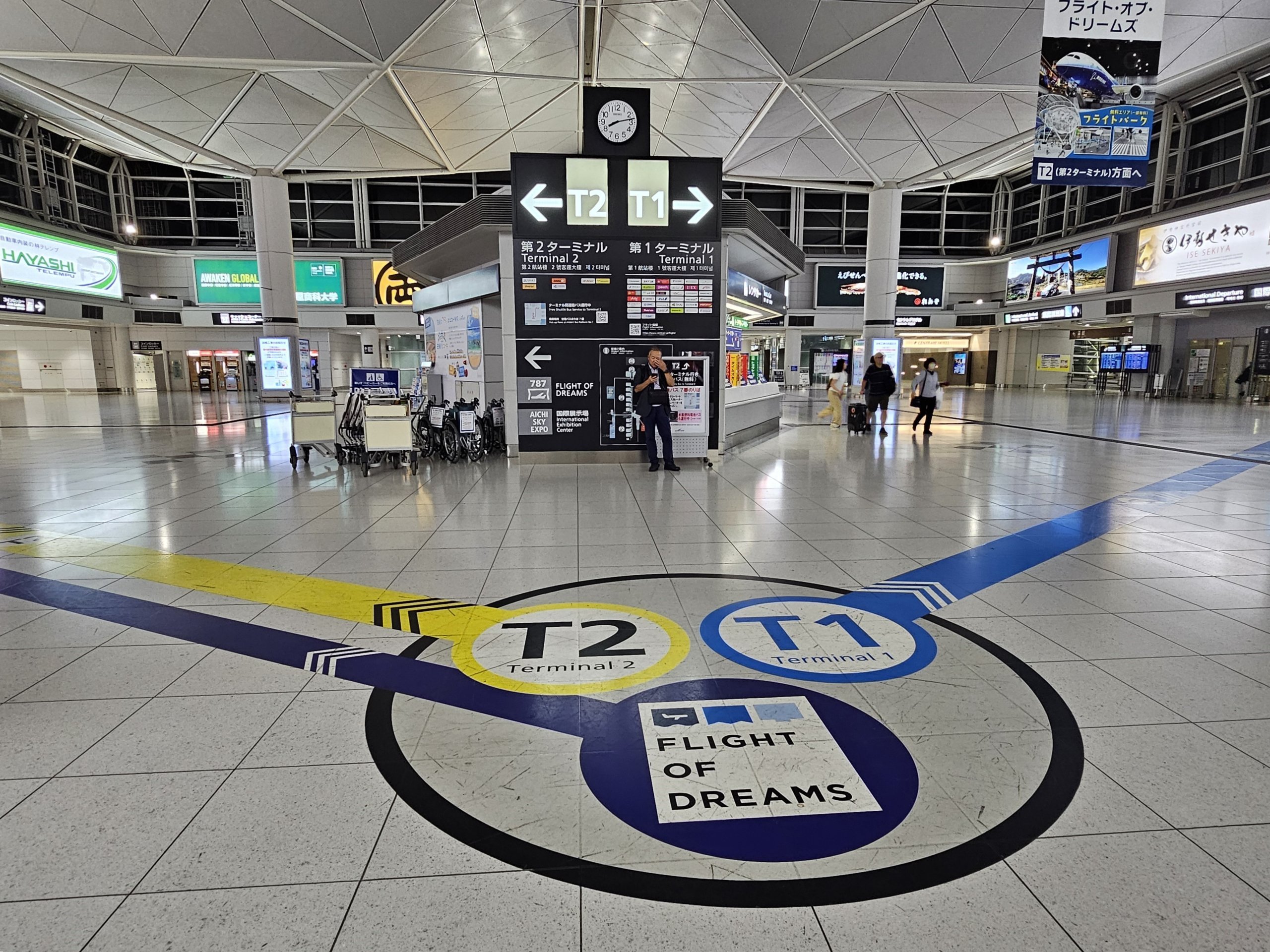 Nagoya Chubu Centrair lufthavn har to terminaler, og det tar omtrent 10 minutter å gå eller 2 minutter med gratis skyttelbuss.