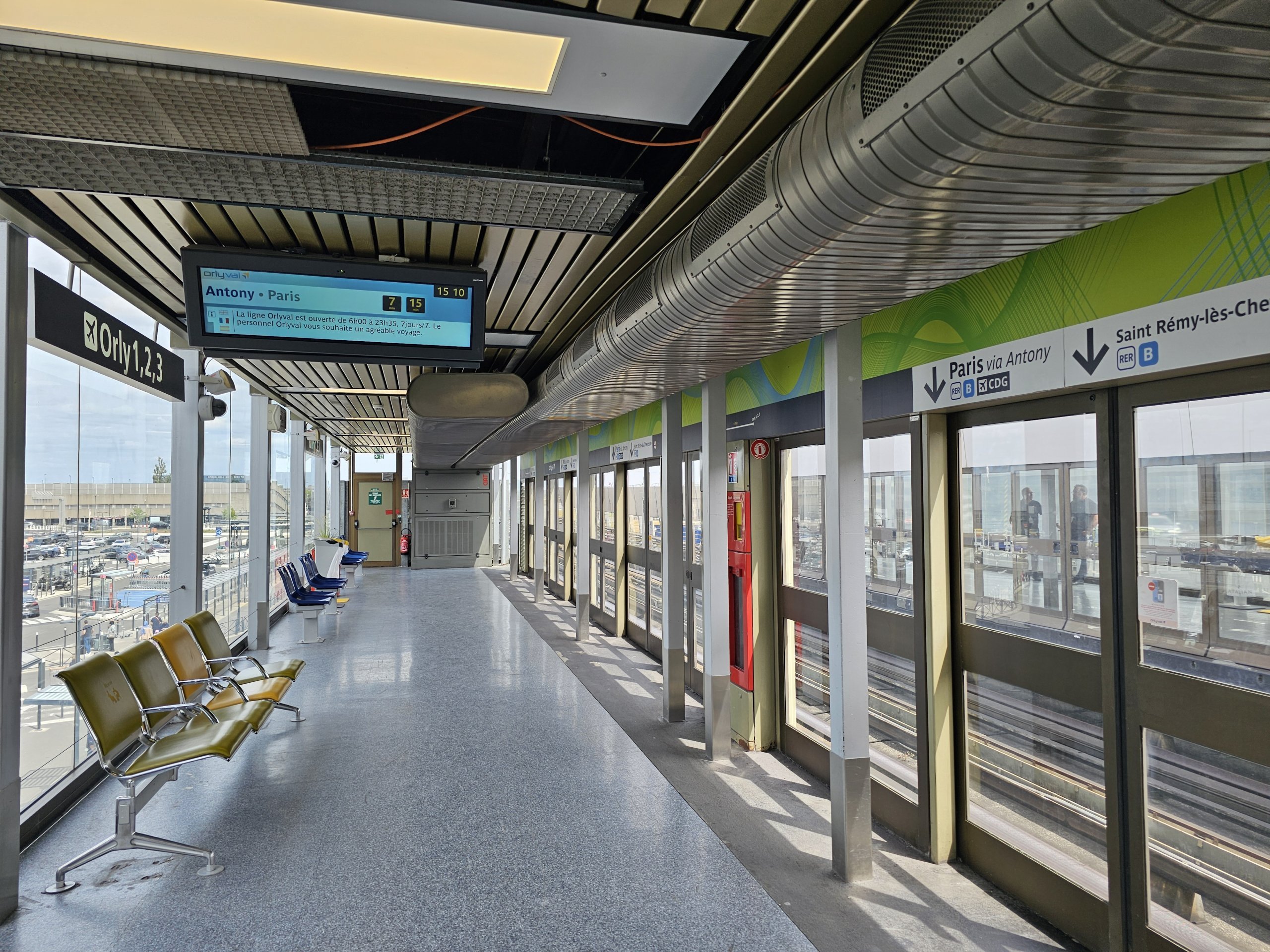 Det automatiske OrlyVal-toget tar deg fra Orly flyplass til Antony stasjon, hvor du bytter til det direkte RER B-toget til Paris-CDG flyplass.