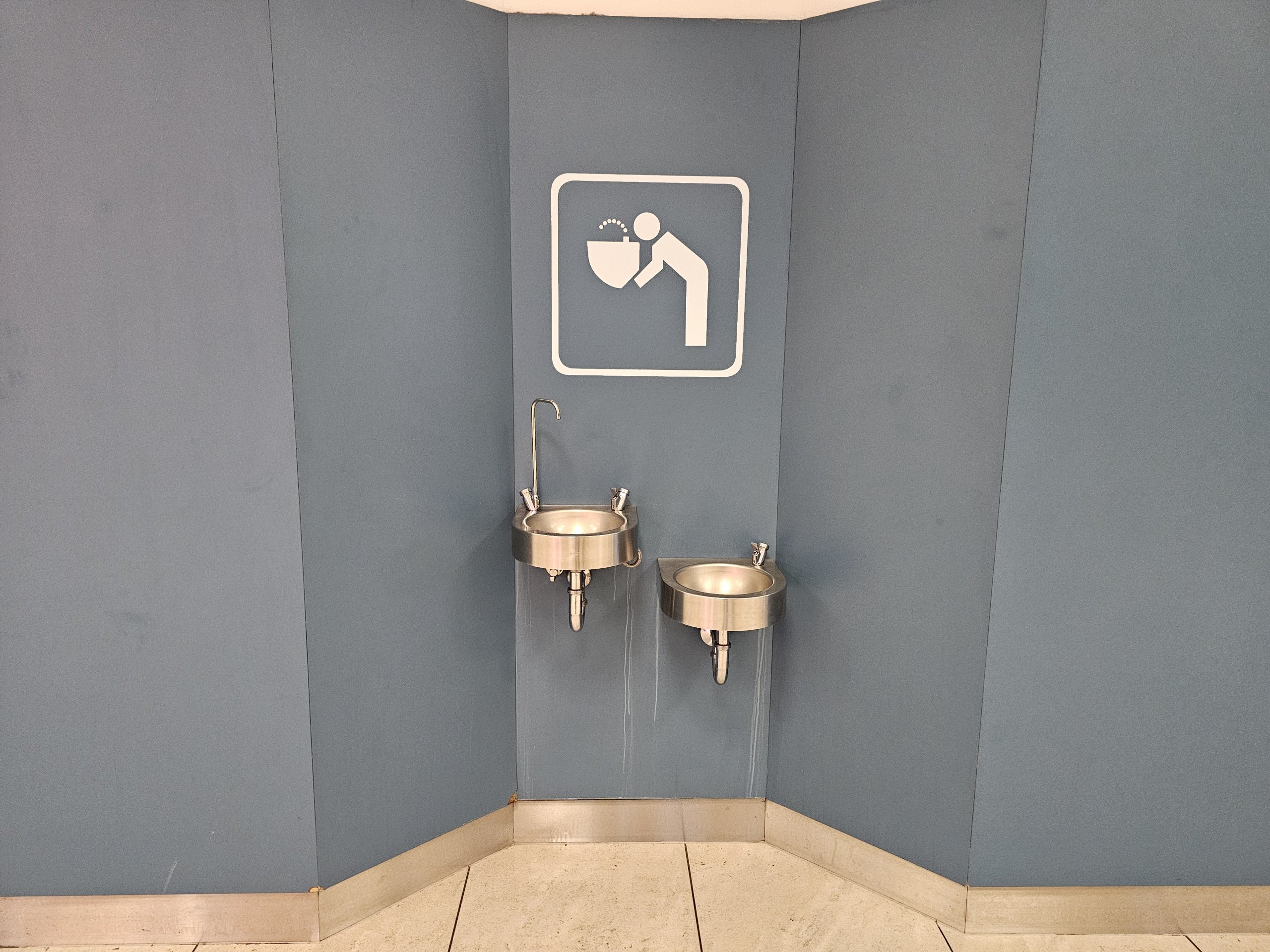 Over hele flyplassen (etter sikkerhetskontrollen) finner du vanndispensere med gratis vann i flaske til å ta med om bord.