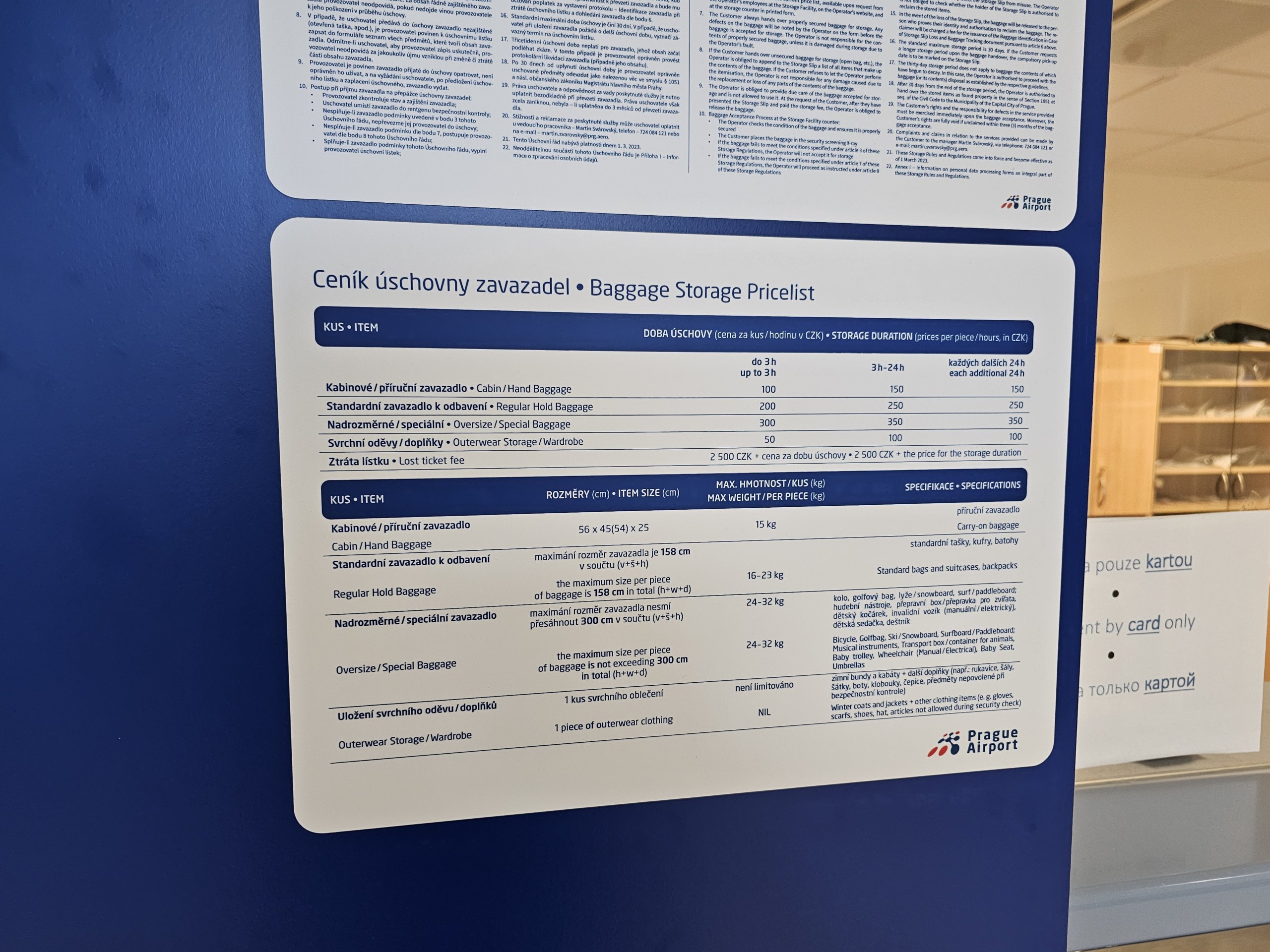 Prisen for 24 timer er 150 czk til 350 czk avhengig av størrelsen på bagasjen, og kan kun betales med kort.